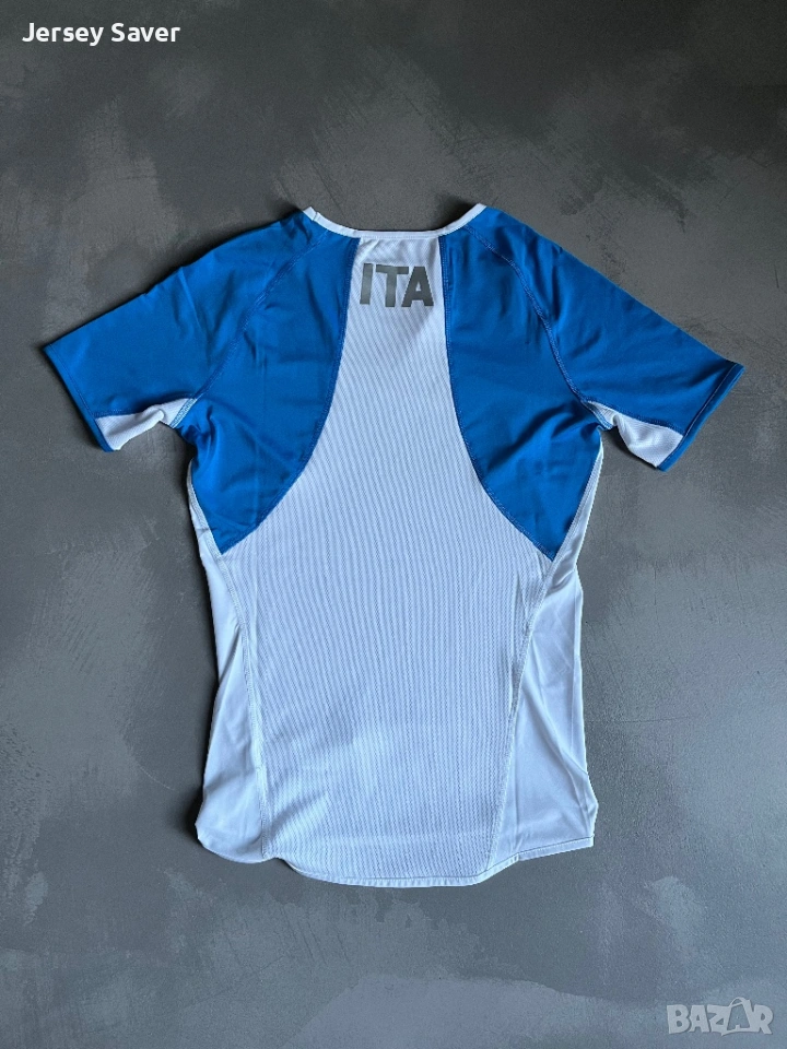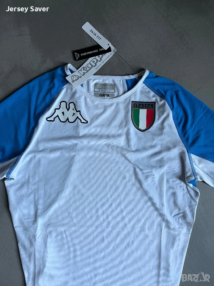 Предлагаме Ви оригинална тренировъчна тениска на Италия от 2002 година, марка Kappa. Бяла със сини ръкави. Размер S (отговаря на XS също). Още с оригиналните етикети. Има малка дупчица отзад , не се вижда много. Чисто нова