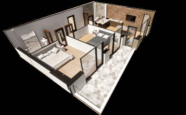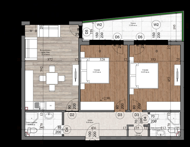 На площ от 107 кв. м. са разпределени следните помещения: всекидневна с кухня, две спални, две бани с тоалетни, широк коридор и голяма тераса с красива панорама към града.