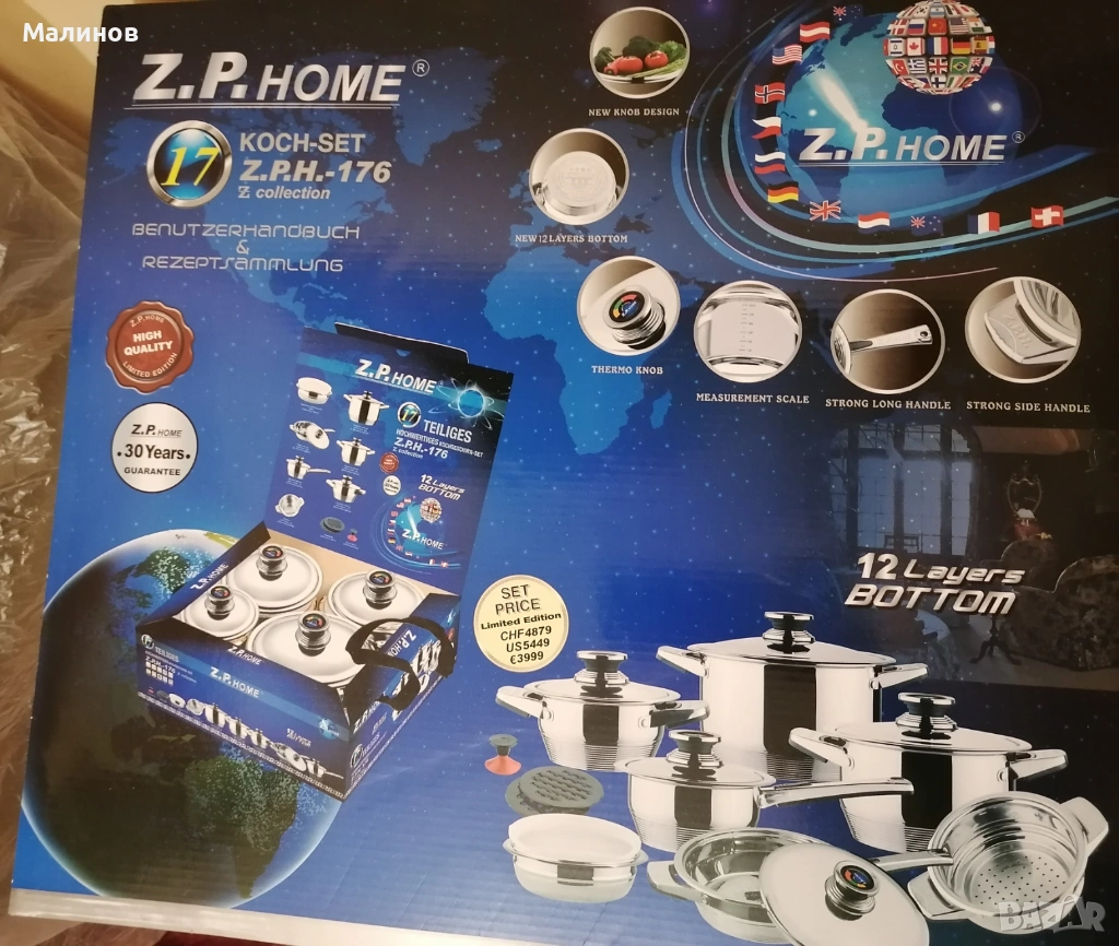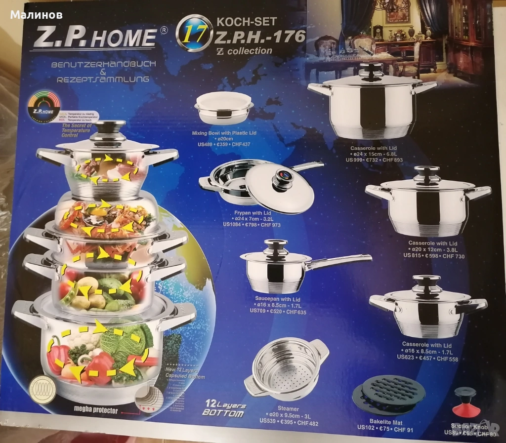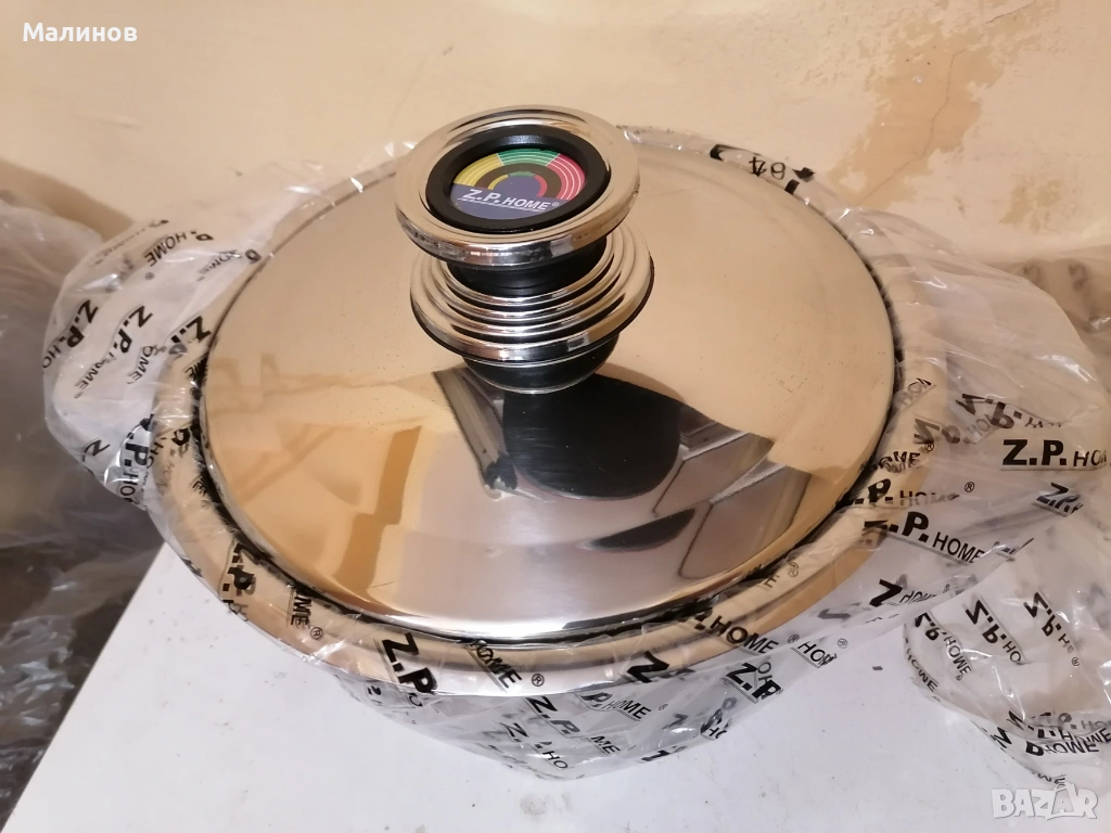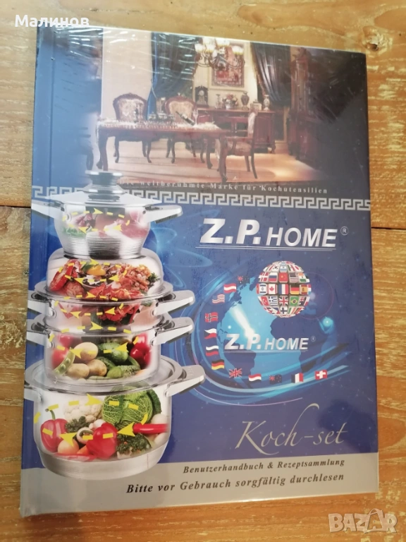 Сервиз от тенджери за готвене с масивни дъна, пълен нов комплект Z.P.Home, картон с опис на частите му и книжка с ръководство и рецепти.