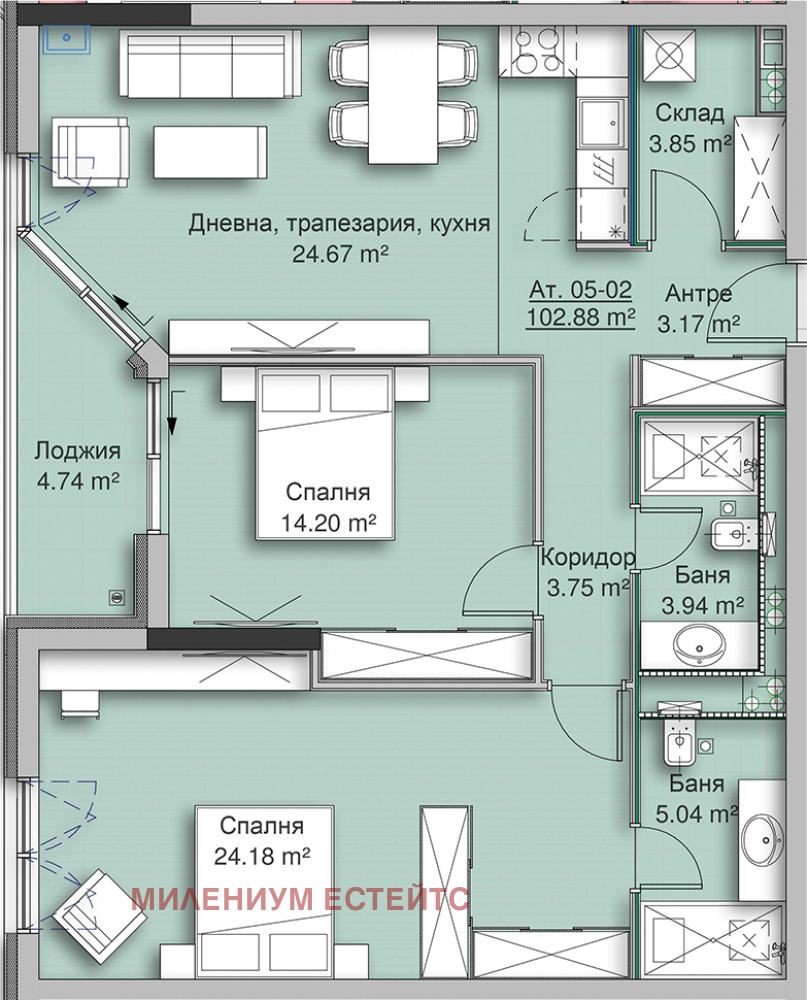 входно антре, коридор, дневна с кухня, две спални, две бани с тоалетна, гардеробна