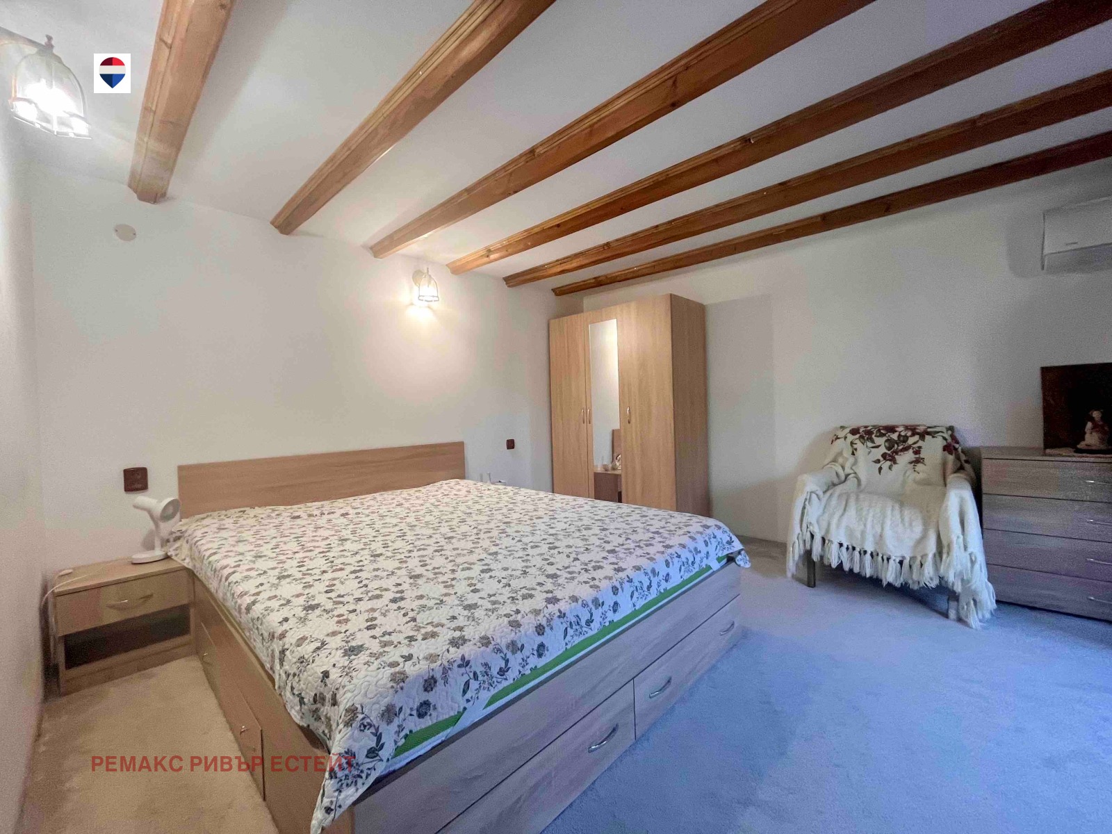 - Просторна основна спалня с високи тавани и открити дървени греди;