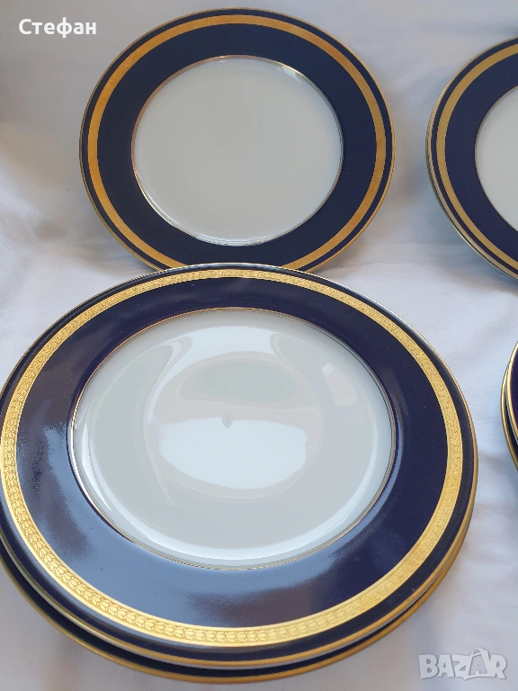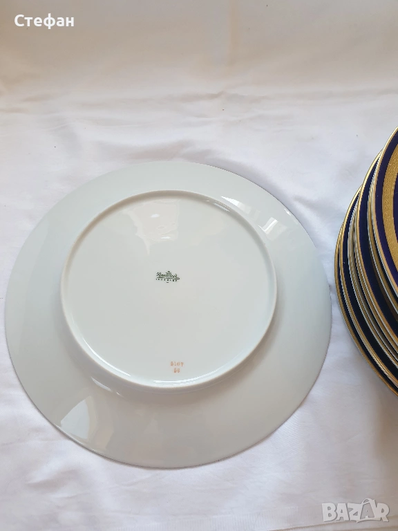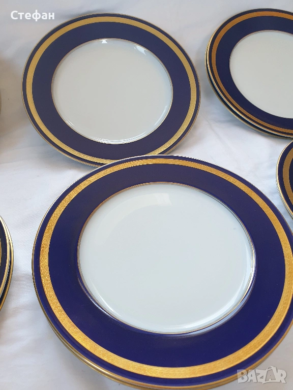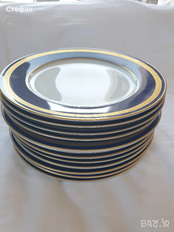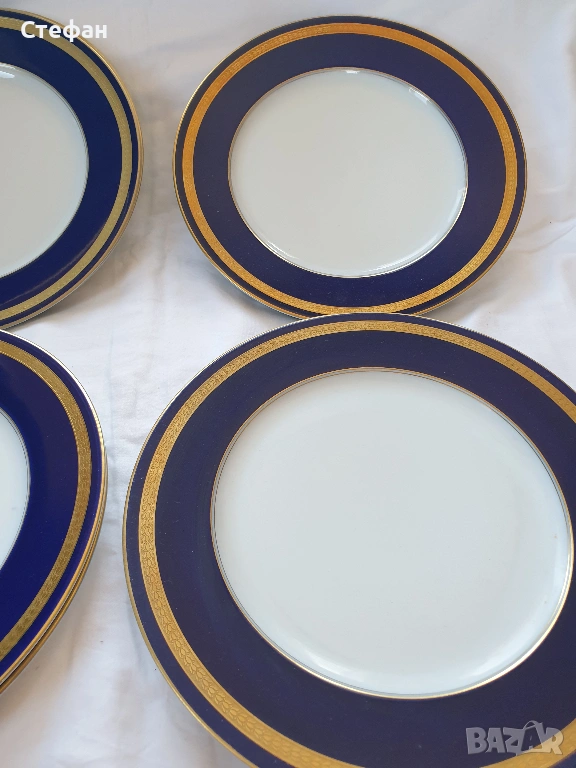 Комплект кобалтови порцеланови чинии с позлата за основно ястие - Rosenthal в перфектно състояние, произход - Германия, маркировка от 1957 година, височина - 2.5 см / диаметър - 26 см, маркирани.