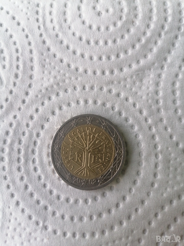 Рядка колекционерска монета 2 евро 2002 г. Дърво на живота и надпис "LIBERTÉ ÉGALITÉ FRATERNITÉ"