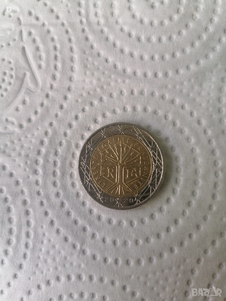 Рядка колекционерска монета 2 евро 2020 г. Дърво на живота и надпис "LIBERTÉ ÉGALITÉ FRATERNITÉ"