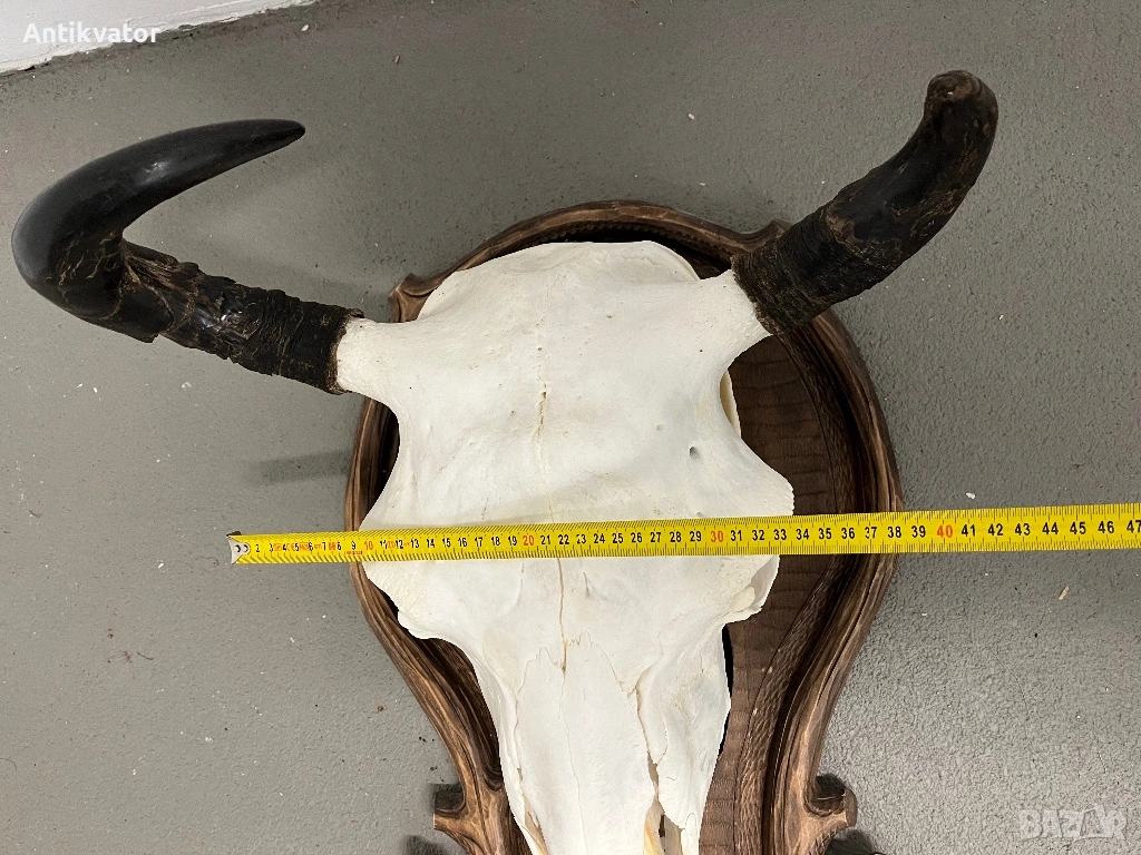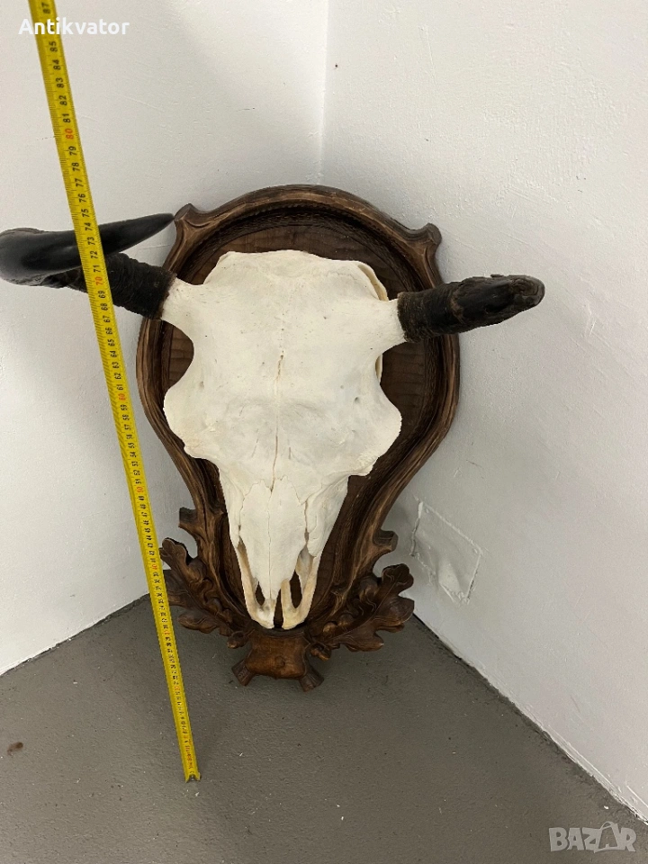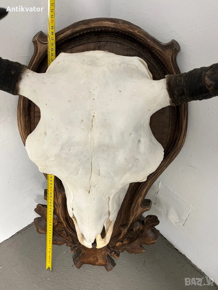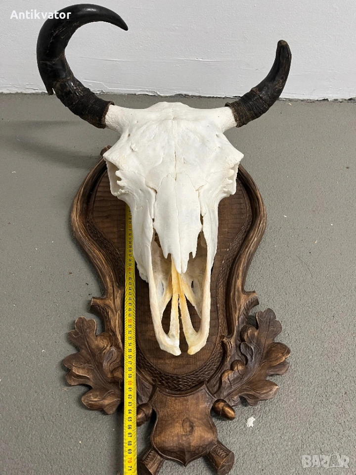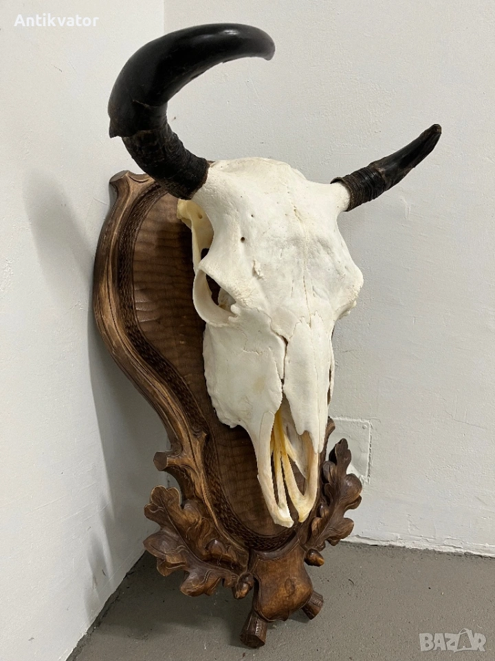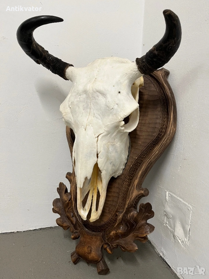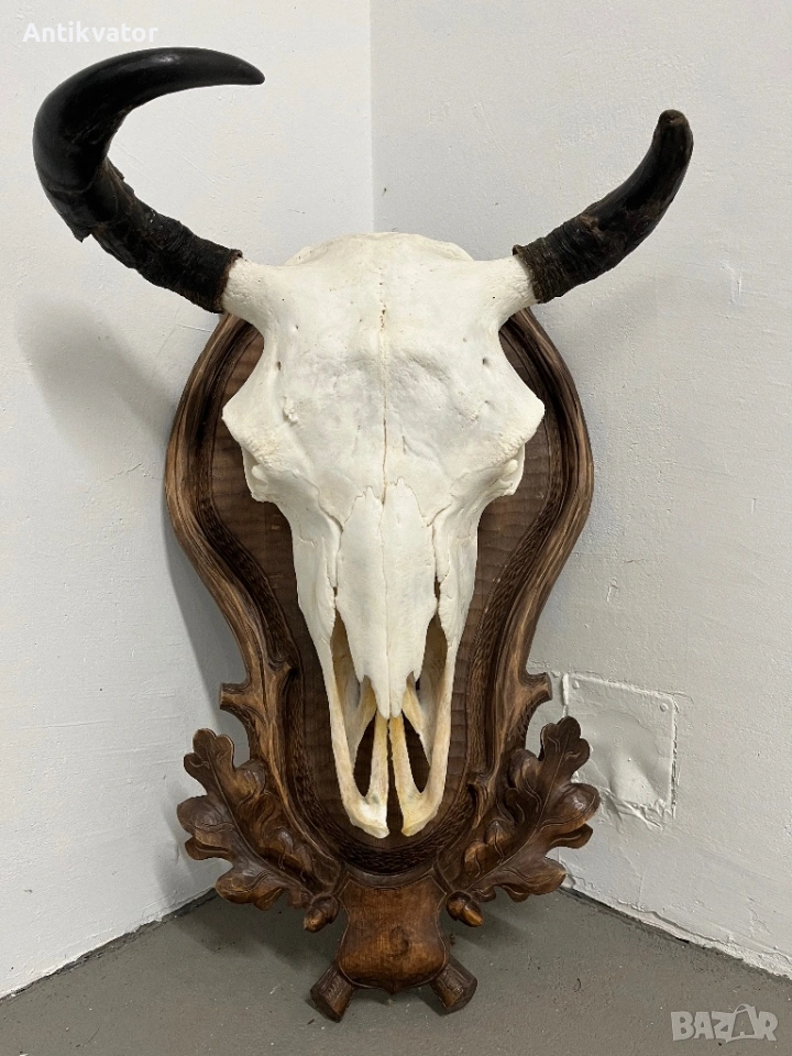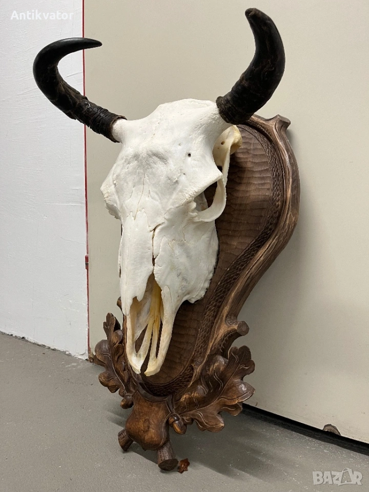 трофей от бизон с много красива, дърворезбована и масивна поставка.