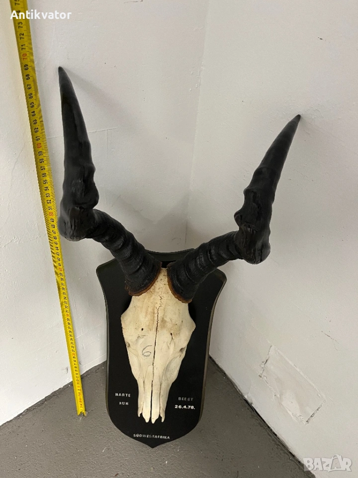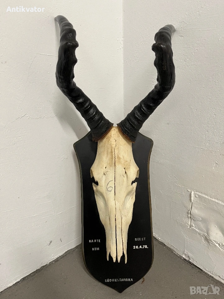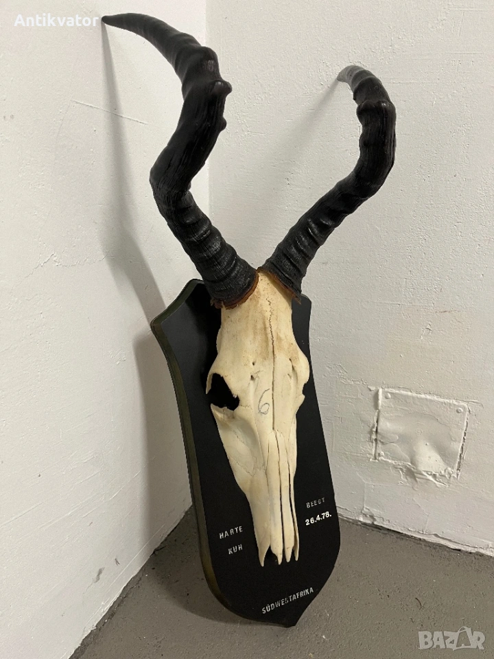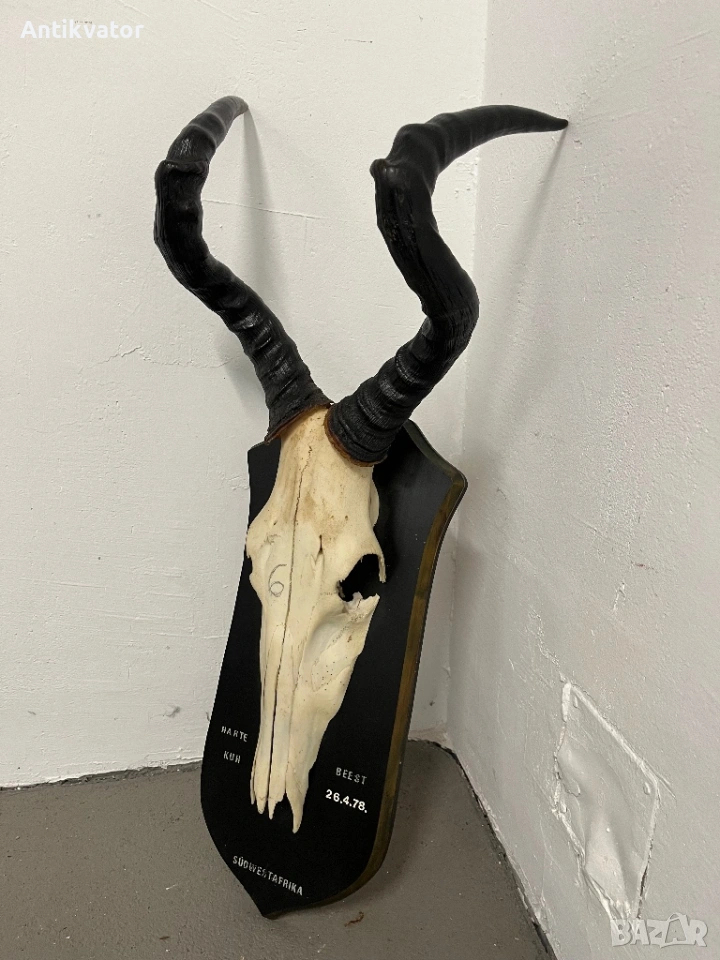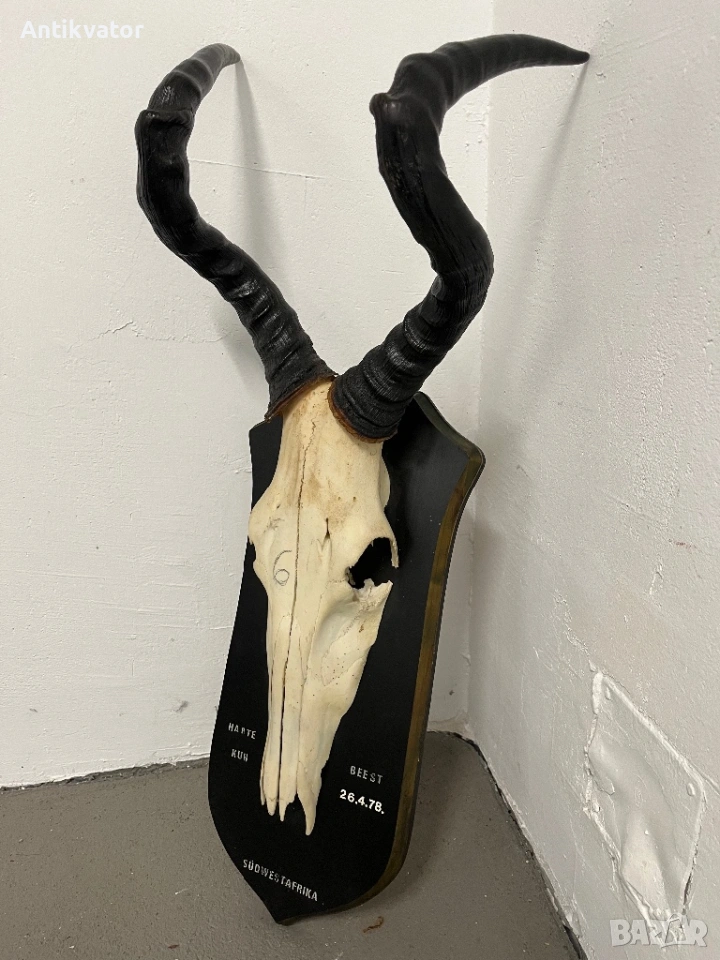 трофей от антилопа - хартебест с много дърворезбована и масивна поставка.
