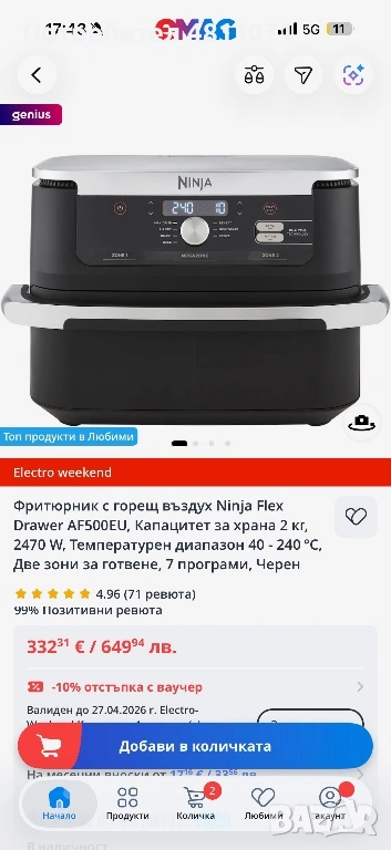 Подобрете вашето кухненско изживяване с Ninja AF500EU FlexDrawer Airfryer и се насладете на предимствата на здравословното пържене, безпроблемното приготвяне и спестяващия място дизайн, всичко това в един впечатляващ уред.