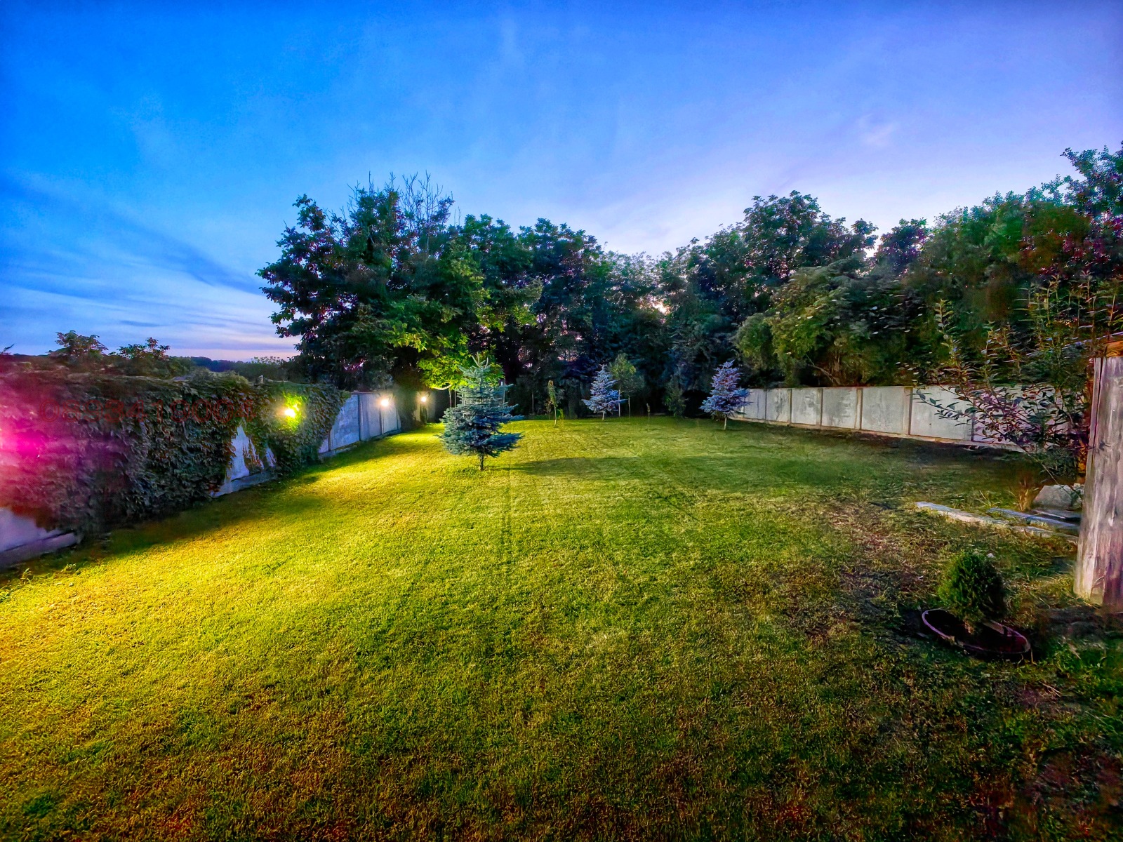 Дворът е просторен и равен, с възможност за озеленяване, градина или допълнителни постройки. Наличен е 10-метров навес и паркоместа за 3 автомобила.