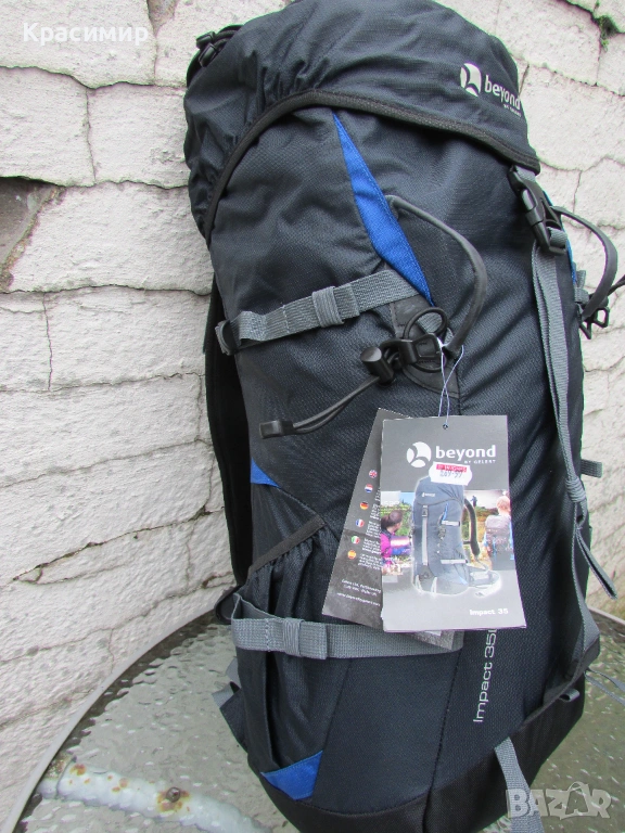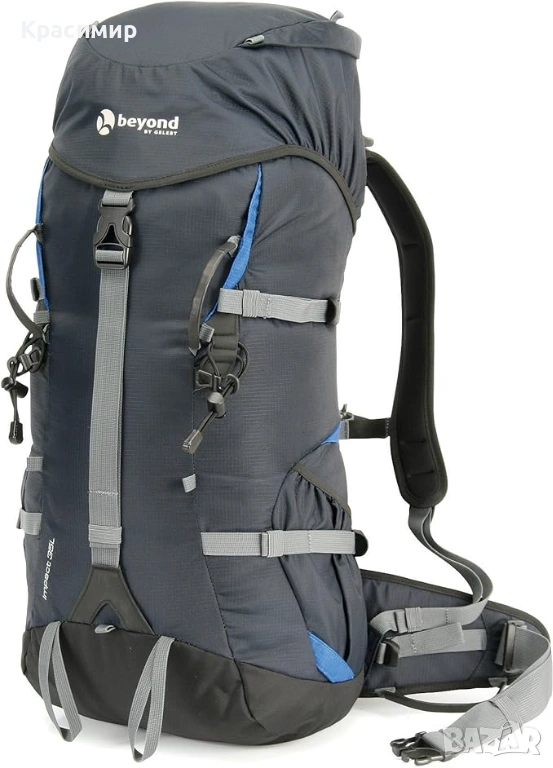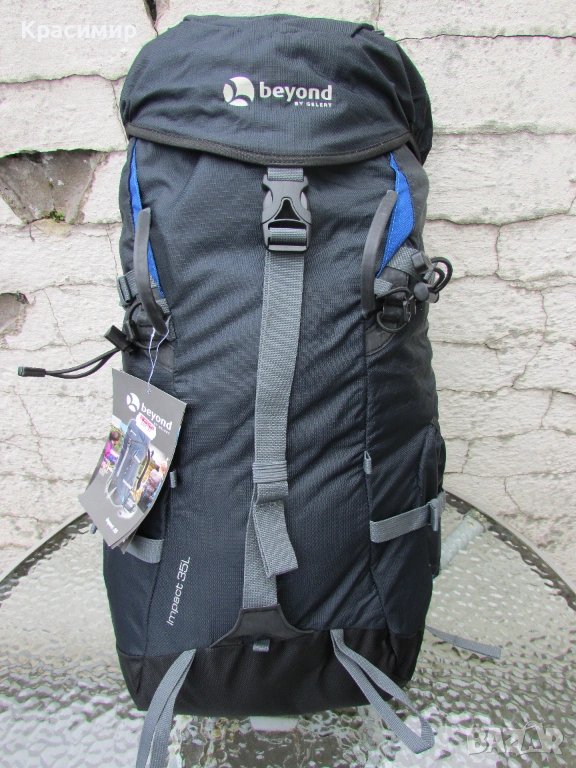 Нова раница Gelert Beyond Impact с вместимост 35 литра. Изработена е от лек, здрав, еластичен и водоотблъскващ материал - N420D Nylon Ripstop. Разполага с основно отделение, с джоб за хидратираща система до 2 литра, вътрешен джоб на капака, и външен заден с ципове, два старнични джоба за бутилки, компресионни странични ленти, подсилени дръжки - халки за екипировка отпред и отгоре и еластични ленти за щеки. Раницата е с лека 3D алуминиева носеща рамка, в комбинация с материала, от който е направена е с тегло 1,160 кг. Гърбът - задния панел Hybrid Contact Pro е омекотен, заедно с регулеруемите презрамки. Закопчаването е пред гърдите и кръста. Размери: 62 x 25 x 23,5 см.