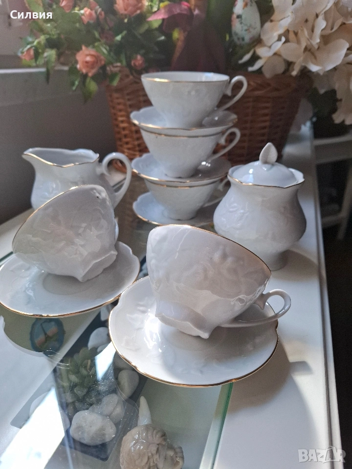 Сервизът е отлично запазен, без видими наранявания, готов да украси вашата маса или да бъде ценно попълнение към колекция от фин порцелан. Липсата на маркировка е характерна за определени серии бутиково производство, при които фокусът е изцяло върху естетиката.