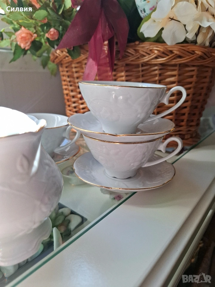 Потопете се в очарованието на отминалите времена с този нежен комплект за кафе, който съчетава класическа антикварна атмосфера и деликатна изработка. Липсата на маркировка само добавя нотка мистерия към неговия произход, оставяйки качеството на порцелана да говори само за себе си.