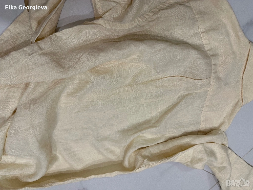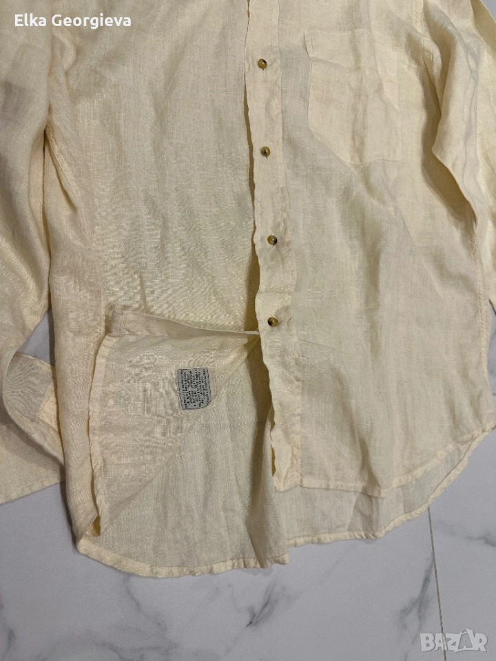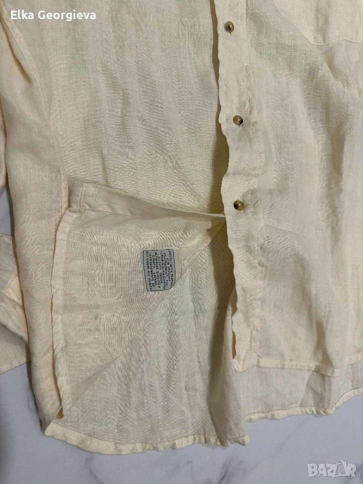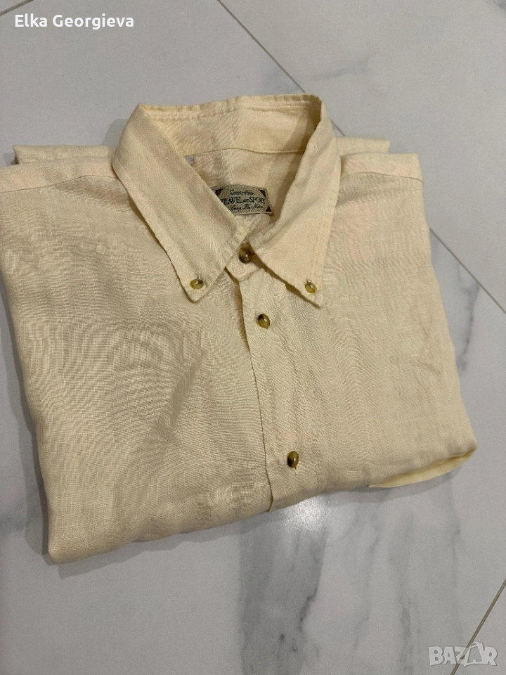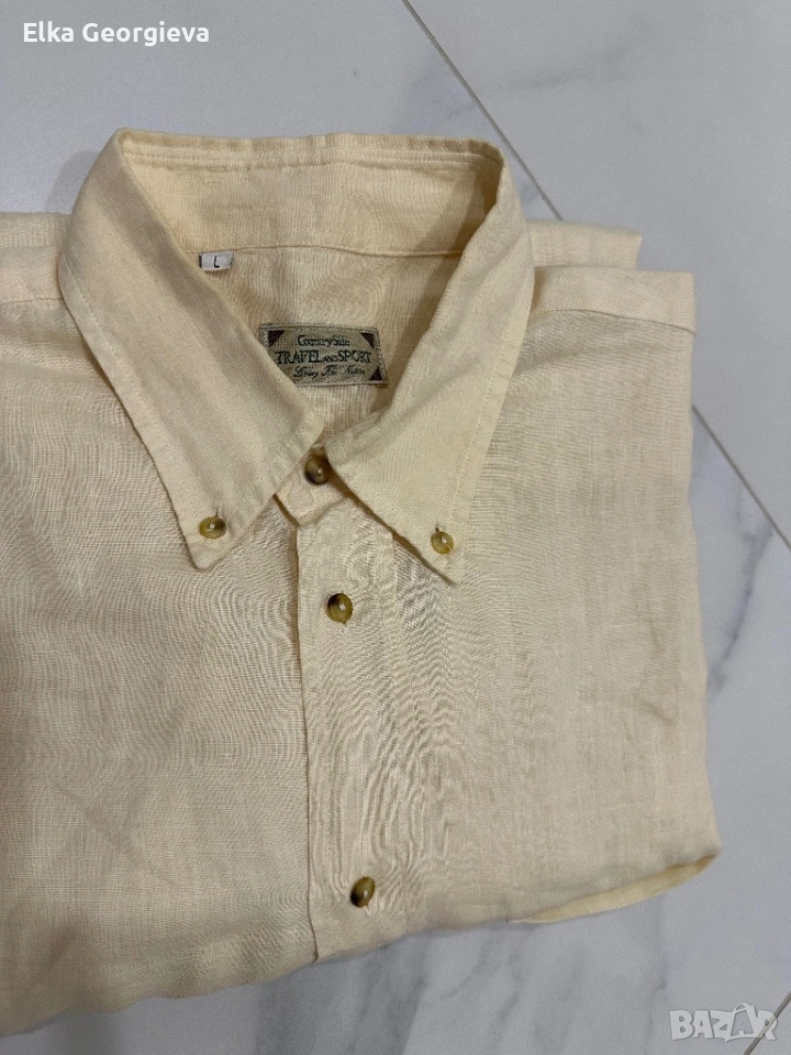 Оригинална ленена мъжка риза в размер L. Вижте снимките ,така ще се ориентирате за реалното състояние на ризата и точни размери в см.