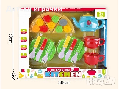 Около 23 елементи за сервиране на чай и хапване, включително чайник, чаши, чинии, прибори и пластмасова пица.