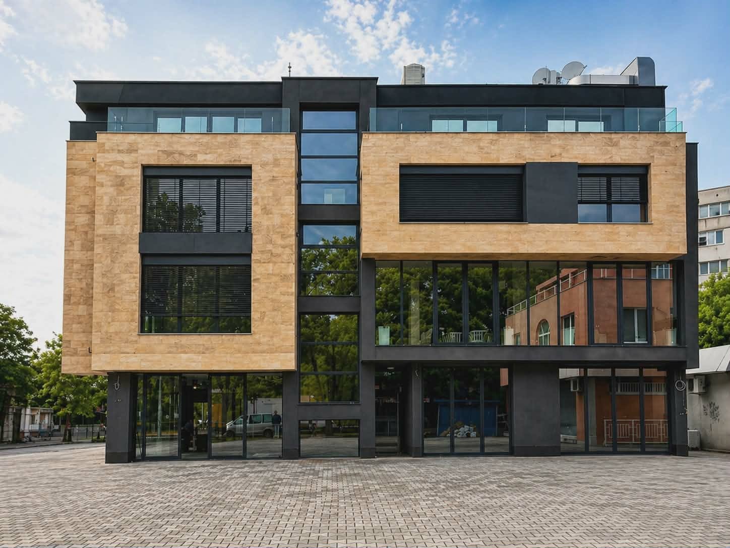 РиълНет офис Партнърс продава самостоятелен обект подходящ и за банков офис в луксозена търговска сграда с висок клас на изпълнение и красива представителна визия в широк център. Площта е разпределена в три етажа - сутерен, партер и първи етаж. Сутерена се състои от различни по големина складови и санитарни помещения и ВИП зала. На партера и първи етаж се намират по две помещения и санитарен възел.