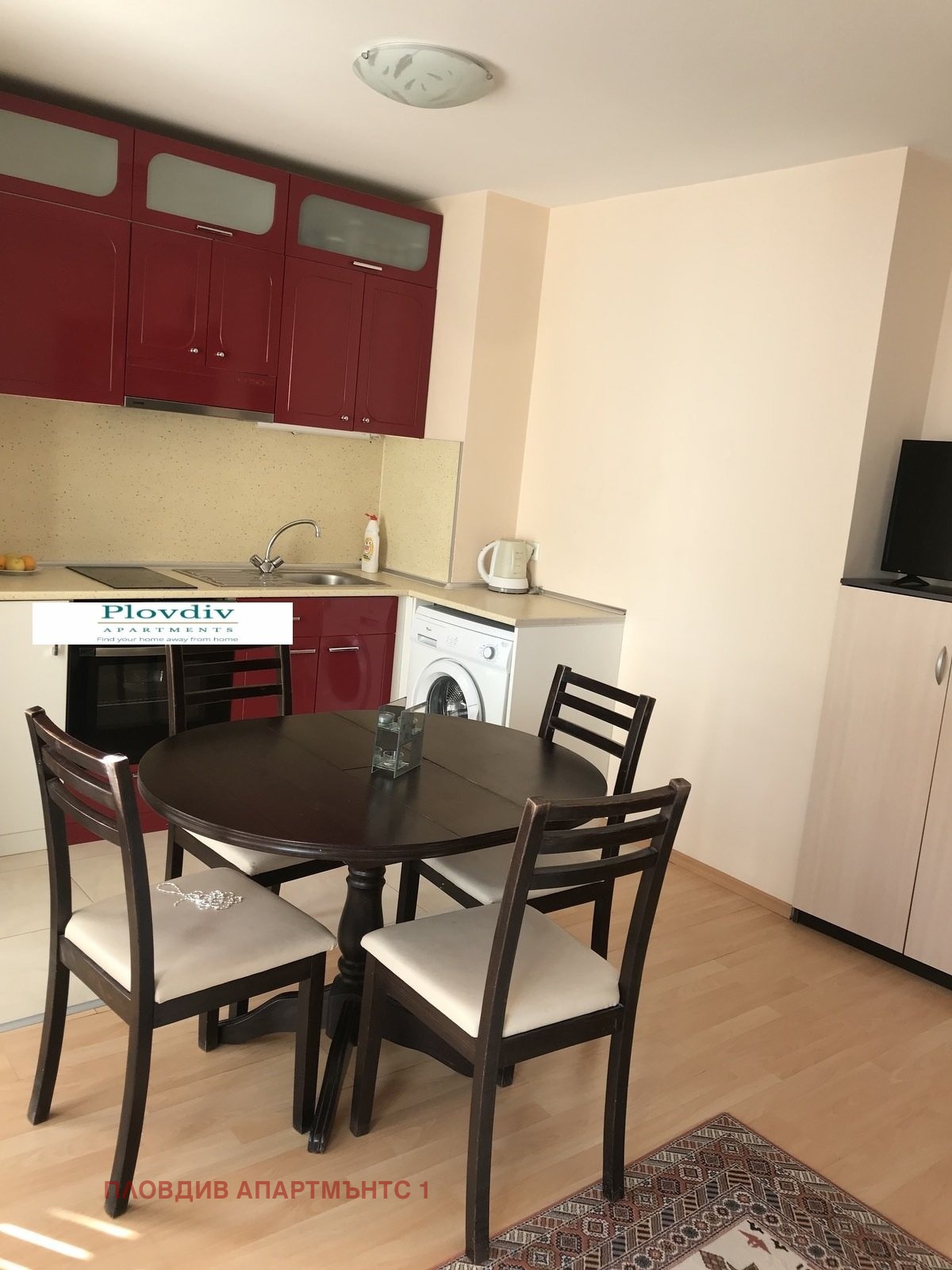 Кухня с трапезария: Кухненски шкафове в ефектен вишнев цвят, трапезна маса с 4 стола, печка, фурна и пералня.