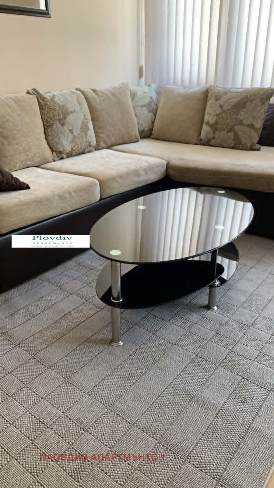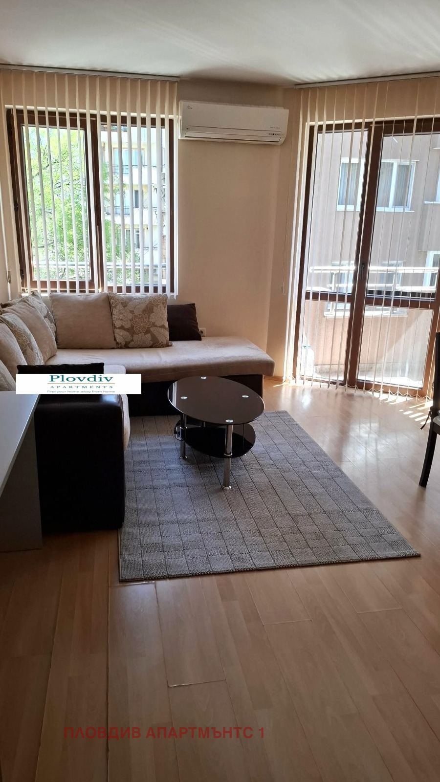 Светъл хол: Просторен ъглов диван, модерна стъклена холна маса и климатик за максимален комфорт.