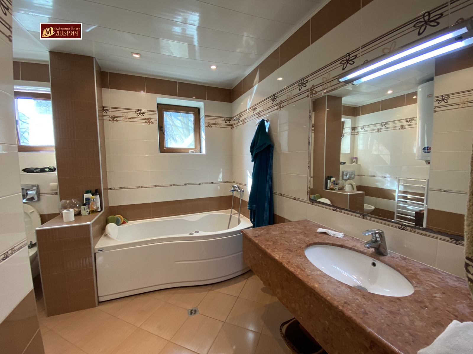 обслужват целия апартамент при по-топло време. Банята е луксозно оборудвана, с качествен фаянс и вана с джакузи. Дограмата е петкамерна. Монтирана е домофонна система с видеонаблюдение. Стените са с дебелина 60 см. с двоен зид и изолация. Сградата е на гредоред. Апартаментът е саниран отвън.