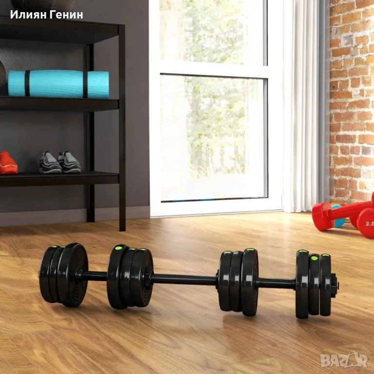 Комплект тежести 20 кг: 4 x 2 кг, 4 x 1,5 кг и 4 x 1,25 кг. 2 x щанга за щанга 0,5 кг