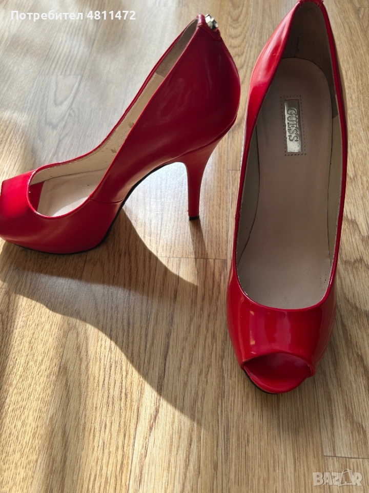 Дамски елегантни обувки на висок ток от GUESS, в класически червен лачен дизайн с отворени пръсти. Много стилни и ефектни – подходящи за официални поводи, вечерни излизания или събития.