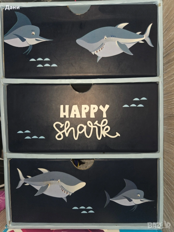 Компактен шкаф за съхранение с три чекмеджета, украсен с весели изображения на акули. Идеален за съхранение на малки предмети и аксесоари. Изработен от качествени материали, с практични чекмеджета за лесен достъп. Подходящ за детска стая или офис.