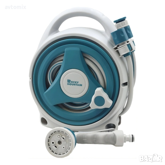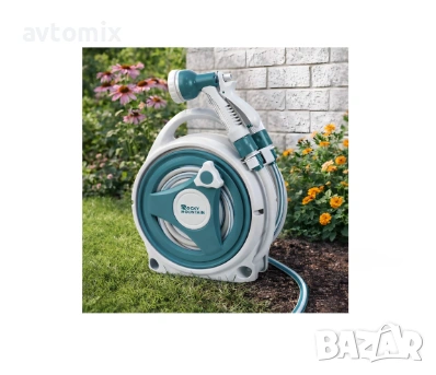 Практичен и удобен комплект градински маркуч с макара, създаден за лесно и ефективно поливане и почистване. Благодарение на компактния дизайн и автоматичната система за навиване, маркучът се използва и съхранява без усилие, без заплитане и усукване.