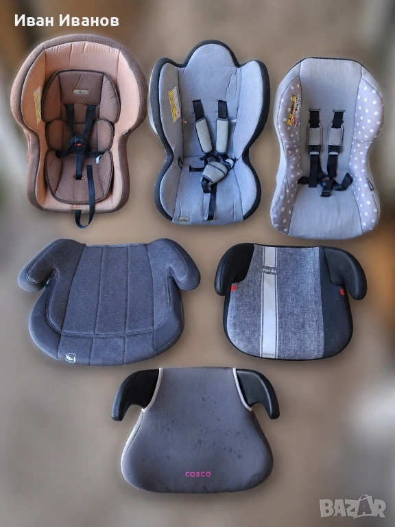 Продавам детски столчета за кола с облегалка и 5-точкови колани, както и бустери без облегалка. Подходящи за различни възрастови групи.