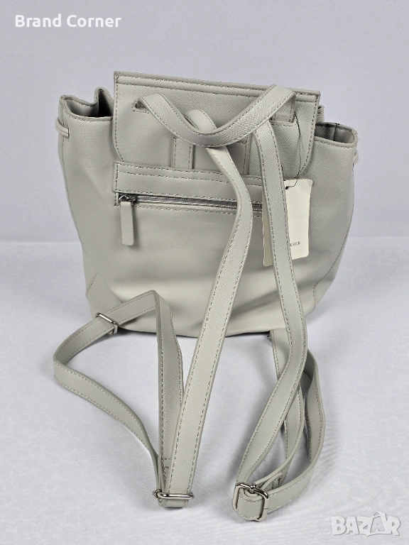 Чантата е с регулируеми презрамки, може да се носи удобно като раница, а дизайнът ѝ е компактен, но достатъчно функционален за лични вещи. Изработена е от текстурирана еко кожа с фин блясък и сребристи метални елементи. Отпред има капак с лого Gerry Weber, а на гърба – външен джоб с цип за по-бърз достъп.