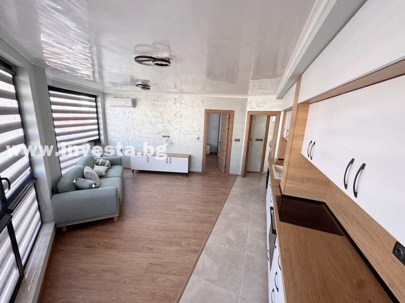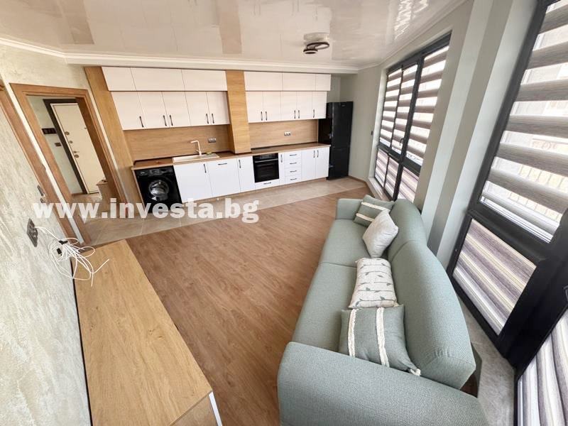 Оферта 43426. Модерно и стилно обзаведен тристаен апартамент, намиращ се в нова сграда, въведена в експлоатация 2025 година. Сградата се намира в близост до хотел Холидей Инн. Състои се от хол с трапезария и кухненски бокс, две спални, баня с тоалетна, антре и панорамна тераса. Изложение юг-север-изток. Мнотирани са три климатика и всички необходими ел.уреди в кухнята - керамични котлони, фурна, абсорбатор, хладилник, съдомиялна, пералня. Напълно оборудвана баня. Имотът е готов за обитаване, без да е необходимо да се влагат допълнителни средства. Сградата е с асансьор и луксозни общи части.