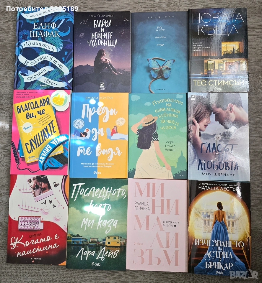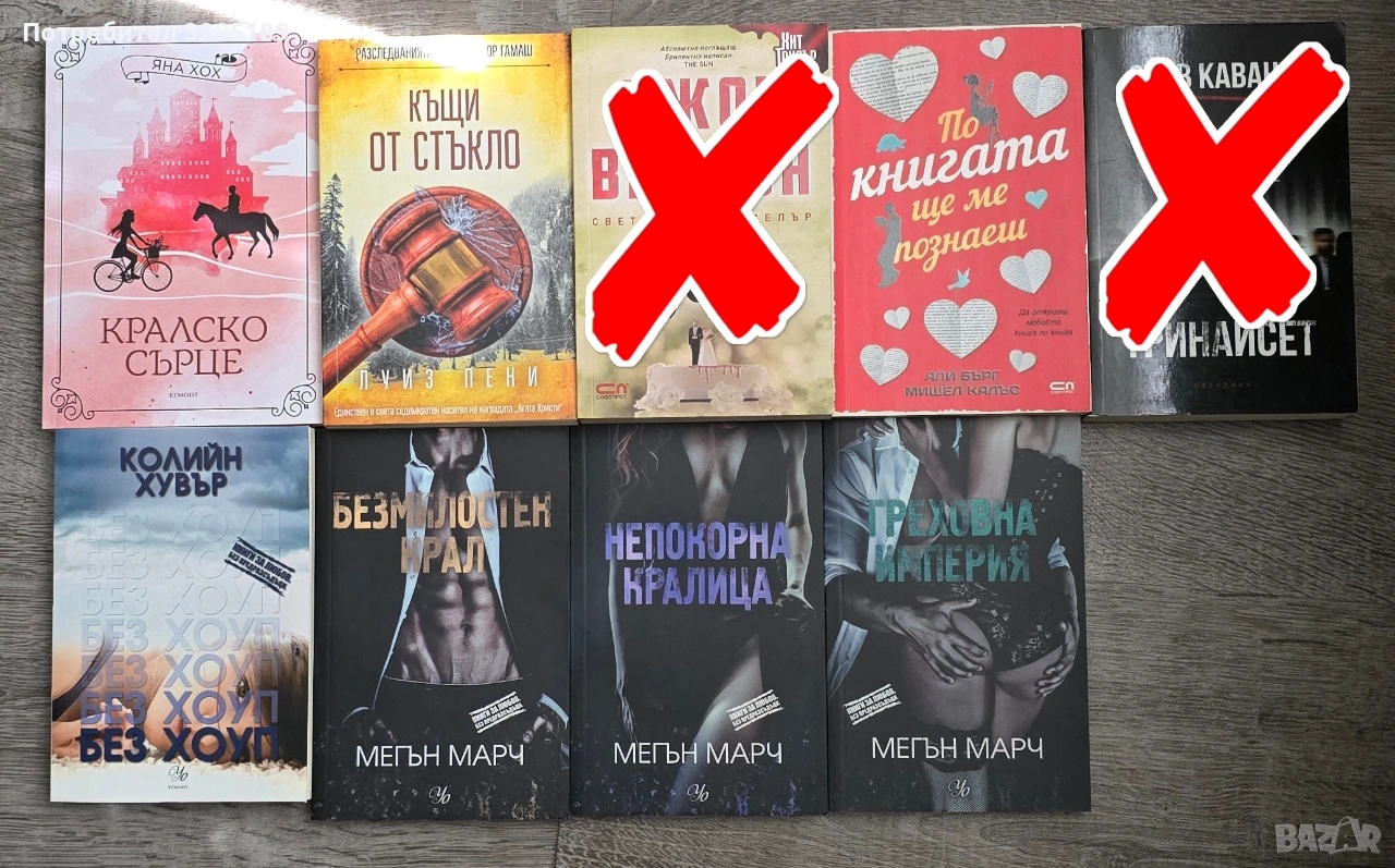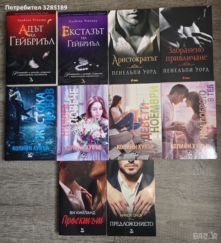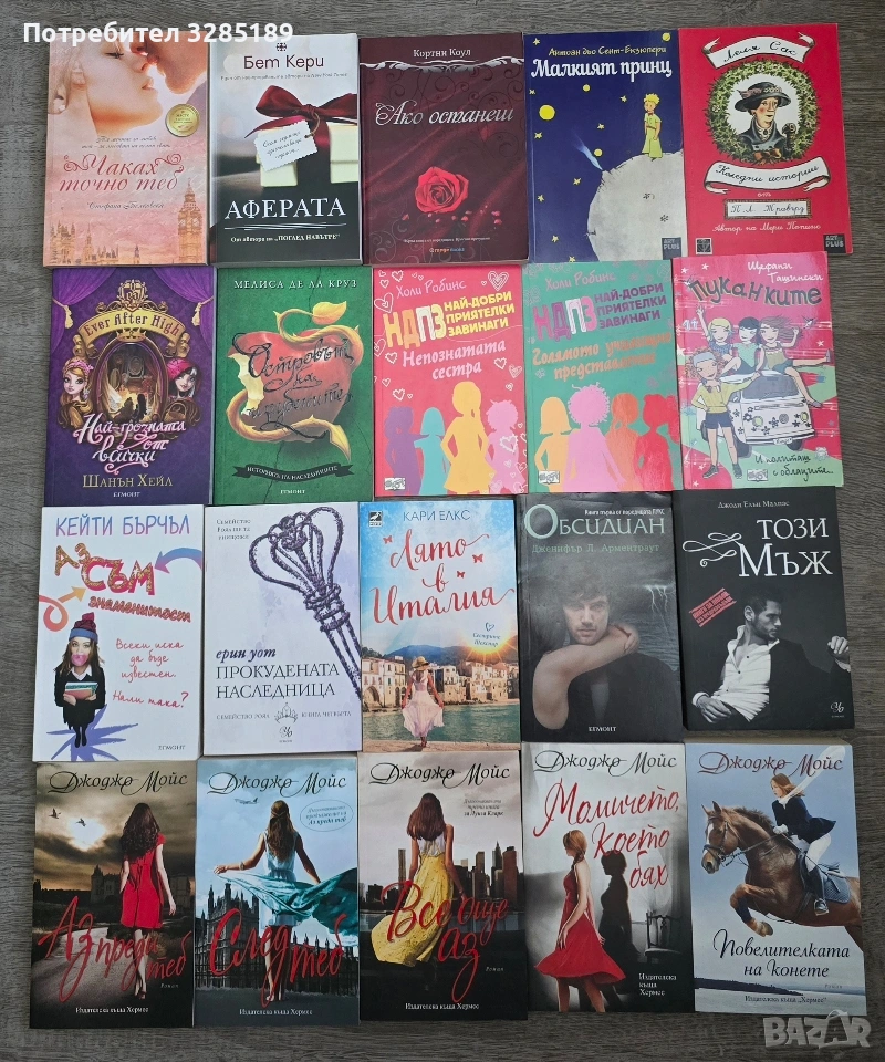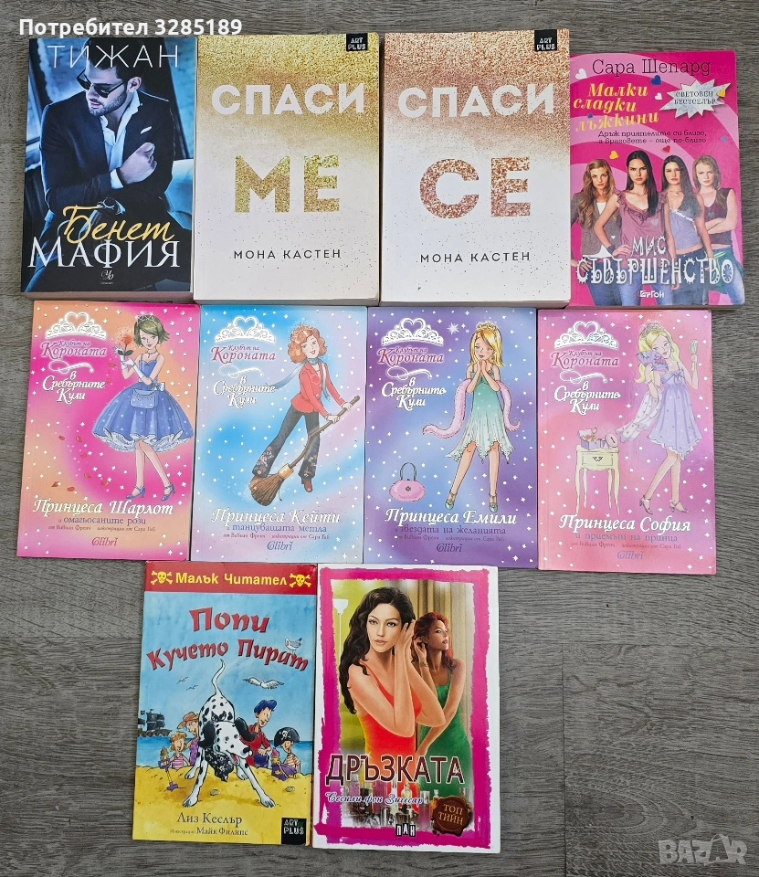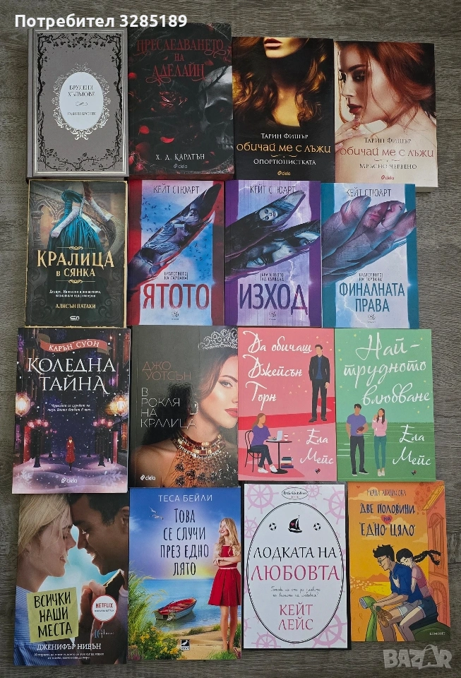 – "Брулени хълмове" на Емили Бронте - 8 евро, чисто нова, в отлично състояние, твърди корици. – "Преследването на Аделайн" на Х. Д. Карлтън - 11 евро, чисто нова, в отлично състояние, меки корици. – "Обичай ме с лъжи - Опортюнистката" на Тарин Фишър - 5 евро, чисто нова, в отлично състояние, меки корици. – "Обичай ме с лъжи: Мръсно червено" на Тарин Фишър - 5 евро, чисто нова, в отлично състояние, меки корици. – "Кралица в сянка" на Алисън Патаки - 8 евро, чисто нова, в отлично състояние, меки корици. – "Ятото" на Кейт Стюарт - 7 евро, четена само веднъж, в много добро състояние, меки корици. – "Изход" на Кейт Стюарт - 8,50 евро, чисто нова, в отлично състояние, меки корици. – "Финалната права" на Кейт Стюарт - 8,50 евро, чисто нова, в отлично състояние, меки корици. – "Коледна тайна" на Карън Суон - 7 евро, чисто нова, в отлично състояние, меки корици. – "В рокля на кралица" на Джо Уотсън - 5 евро, четена само веднъж, в много добро състояние, меки корици. – "Да обичаш Джейсън Торн" на Ела Мейс - 5,50 евро, чисто нова, в отлично състояние, меки корици. – "Най-трудното влюбване" на Ела Мейс - 9,70 евро, чисто нова, в отлично състояние, меки корици. – "Всички наши места" на Дженифър Нивън - 6,20 евро, четена само веднъж, в отлично състояние, меки корици. – "Това се случи през едно лято" на Теса Бейли - 5 евро, чисто нова, в отлично състояние, меки корици. – "Лодката на любовта" на Кейт Лейс - 1,50 евро, чисто нова, в отлично състояние, меки корици. – "Две половини на едно цяло" на Мони Атанасова - 4 евро, чисто нова, в отлично състояние, меки корици. – "Адът на Гейбриъл" на Силвейн Рейнард - 11 евро, чисто нова, в отлично състояние, меки корици. – "Екстазът на Гейбриъл" на Силвейн Рейнард - 8 евро, чисто нова, в отлично състояние, меки корици. – "Аристократът" на Пенелъпи Уорд - 5,50 евро, чисто нова, в отлично състояние, меки корици. – "Забранено привличане" на Пенелъпи Уорд - 6,50 евро, чисто нова, в отлично състояние, меки корици. – "Жестока любов" на Колийн Хувър - 6,70 евро, четена само веднъж, в много добро състояние, меки корици. – "Никога повече" на Колийн Хувър - 7 евро, чисто нова, в отлично състояние, меки корици. – "Девети ноември" на Колийн Хувър - 6,70 евро, чисто нова, в отлично състояние, меки корици. – "Най-доброто в теб" на Колийн Хувър - 6 евро, чисто нова, в отлично състояние, меки корици. – "Проектът" на Ви Кийланд - 8 евро, чисто нова, в отлично състояние, меки корици. – "Предложението" на Никол Сноу - 9 евро, чисто нова, в отлично състояние, меки корици. – "Бенет Мафия" на Тижан - 8 евро, четена само веднъж, в много добро състояние, меки корици. – "Спаси ме" на Мона Кастен - 10 евро, четена само веднъж, в отлично състояние, меки корици. – "Спаси се" на Мона Кастен - 10 евро, четена само веднъж, в отлично състояние, меки корици. – "Малки сладки лъжкини: Мис Съвършенство" на Сара Шепард - 6 евро, чисто нова, в отлично състояние, меки корици. – "Клубът на короната: Принцеса Шарлот и омагьосаните рози" на Вивиан Френч - 2 евро, чисто нова, в отлично състояние, меки корици. – "Клубът на короната: Принцеса Кейти и танцуващта метла" на Вивиан Френч - 2 евро, чисто нова, в отлично състояние, меки корици. – "Клубът на короната: Принцеса Емили и звездата на желанията" на Вивиан Френч - 2 евро, чисто нова, в отлично състояние, меки корици. – "Клубът на короната: Принцеса София и приемът на принца" на Вивиан Френч - 2 евро, чисто нова, в отлично състояние, меки корици. – "
