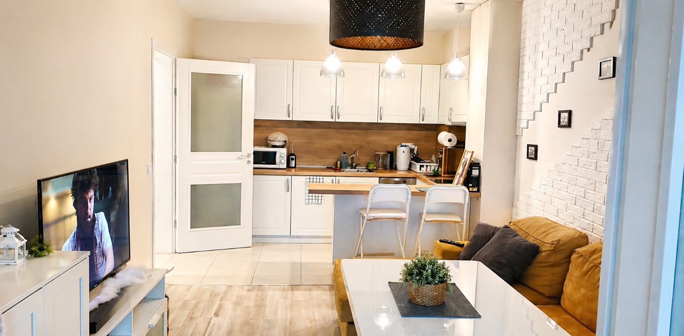 Имотът е обзаведен, с площ 85 кв.м, на 5-ти етаж от 8 етажна сграда с асансьор. Разпределението включва входно антре, дневна с кухня и трапезария, две спални, баня с тоалетна, мокро помещение и тераса.