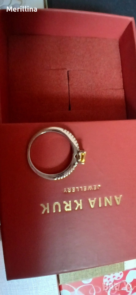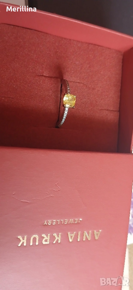 Сребърен пръстен, проба 925, жълт цирконий обграден с по-малки празрачни други от двете му страни, размер 49 - 50. В оригинална кутийка на марката Ania Kruk.