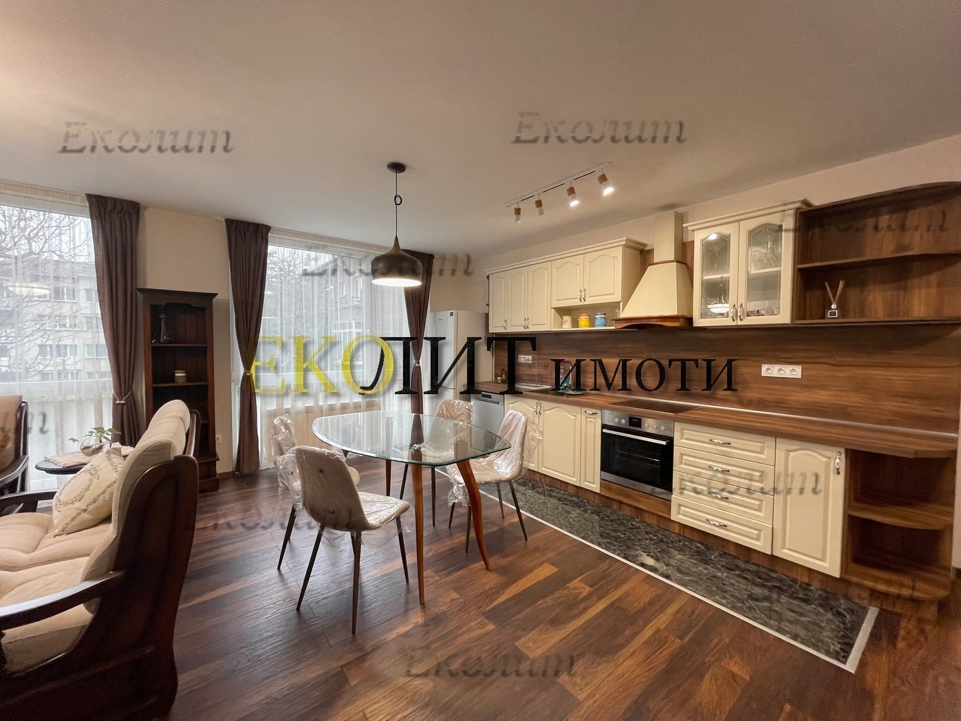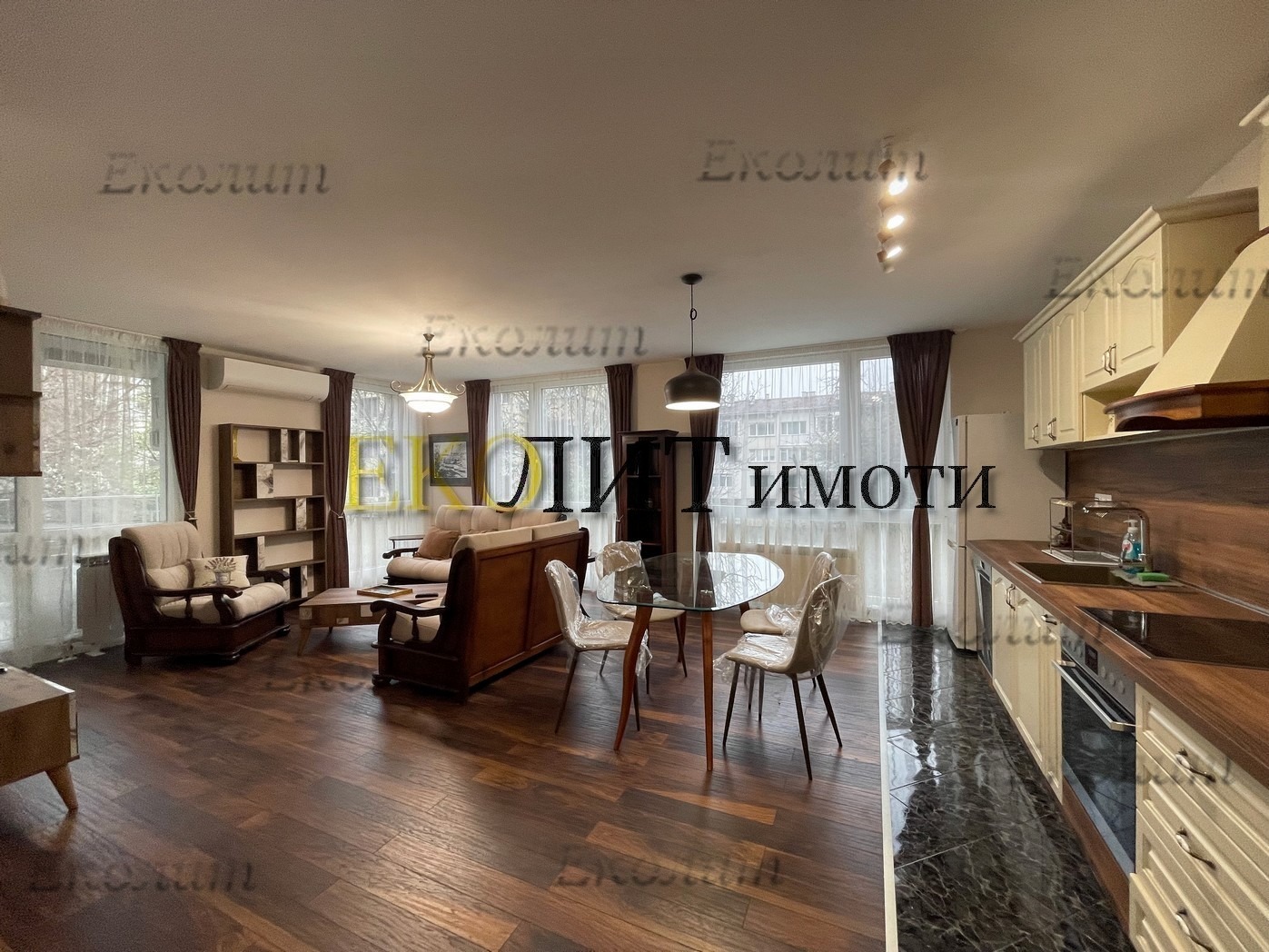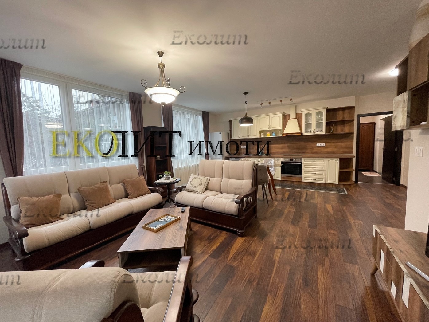 Просторна и светла дневна, трапезария и кухненска част с разточителна мека мебел, холни маси, TV сет с LED телевизор, модулни шкафове, трапезна маса, столове и вградена кухня с бяла техника от висок клас, включително съдомиялна.