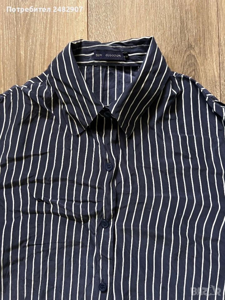 Дамска риза на раета в тъмно синьо и бяло, размер S. Ширина в раменете - 38 см, ширина под мишниците - 48 см, ширина в долната част - 47 см, дължина от рамото до долу - 60 см, дължина на ръкава от рамото - 60 см, ширина на ръкава в долната част - 10 см. Много запазена, почти не е използвана, с малки цепки отстрани (6 см).