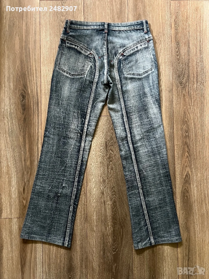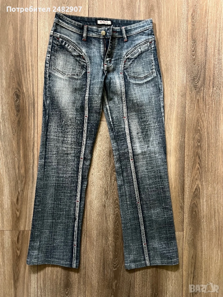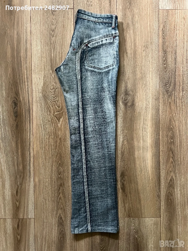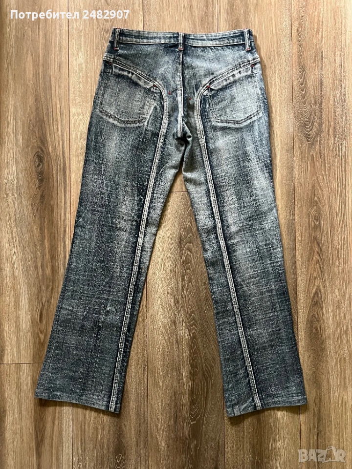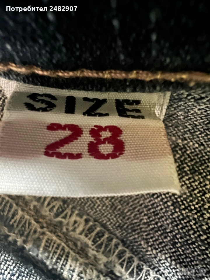 Тъмно сиви дамски дънки, размер 28. Съдържат 95 % памук и 5 % еластан. Ширина в талията - 37 см, дължина от талията до чатала - 22 см, дължина от талията до долу - 96 см, ширина на крачола в долната част - 22 см. Много запазени, почти не са използвани,