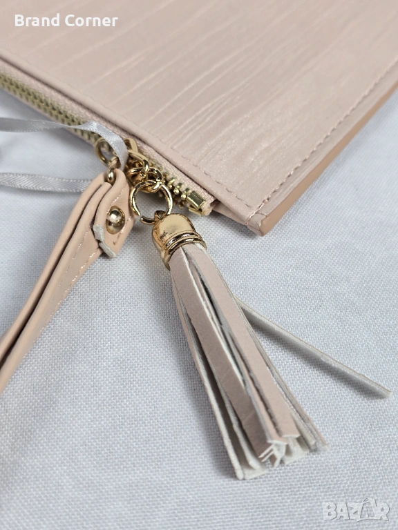 Портмонето разполага с удобна дръжка за китка, декоративен пискюл и златисти елементи, които му придават по-луксозно излъчване. Вътрешността е практична и добре организирана – с отделения за карти, банкноти и документи. Подходящо е и като малка клъч чантичка.