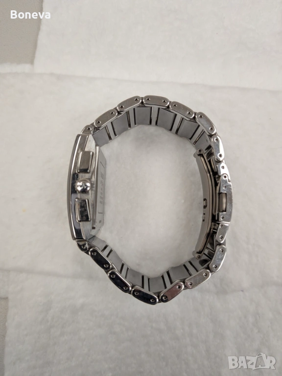 The rectangular case of this watch measures 30 x 36 mm and is made of a combination of stainless steel and high-tech ceramic, which ensures impressive scratch resistance. The white dial is protected by a scratch-resistant sapphire crystal