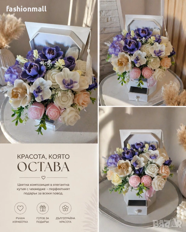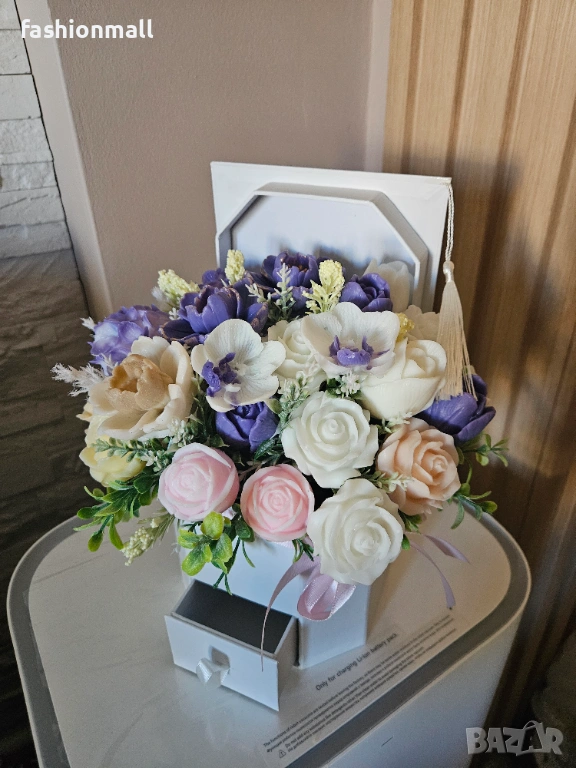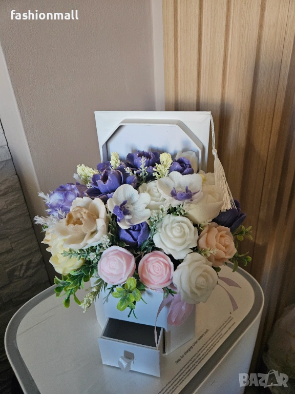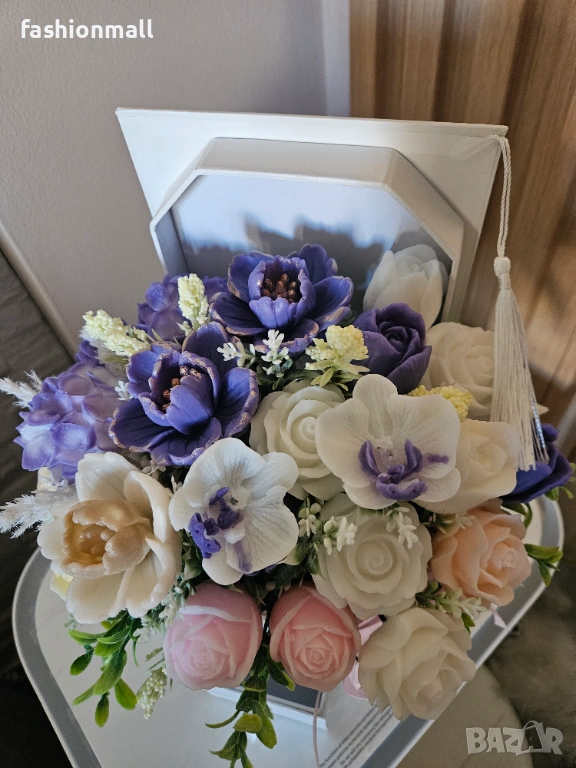 Абитуриентска шапка букет с цветя от ароматен глицеринов сапун. В елегантна кутия с отделение за пари или малък подарък.