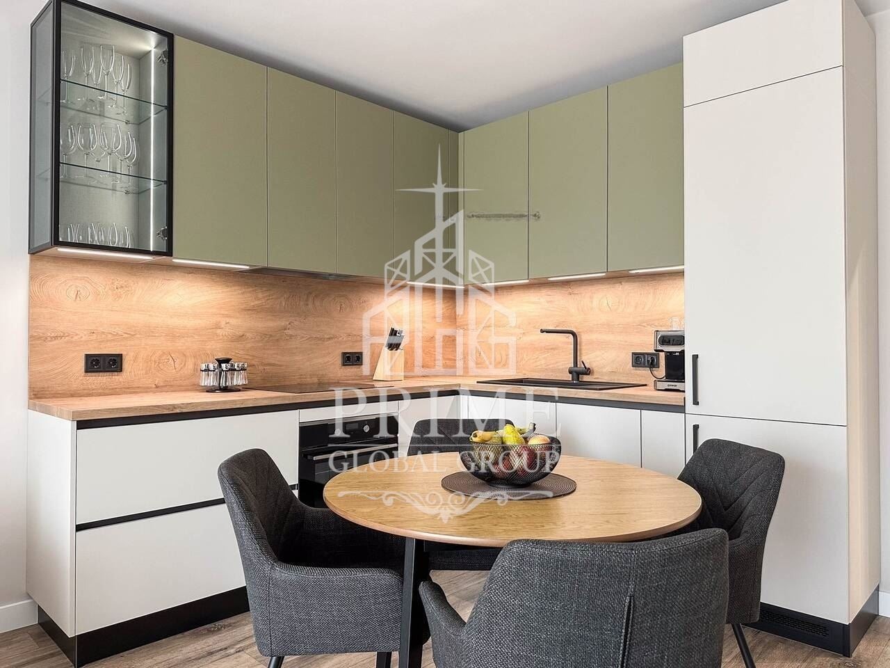 Изработена по поръчка, напълно оборудвана с нови уреди в гаранция фурна, котлони, аспиратор, съдомиялна машина и хладилник.
