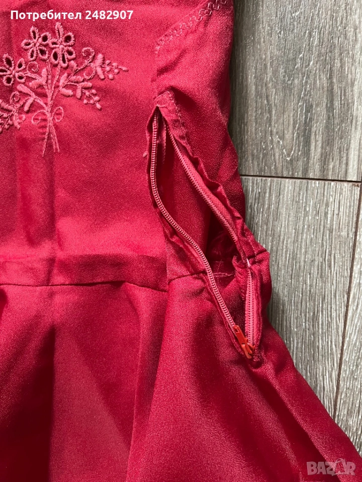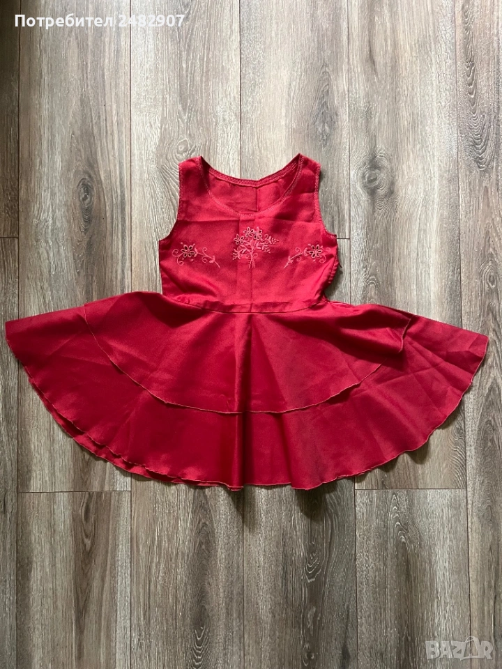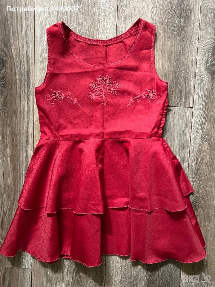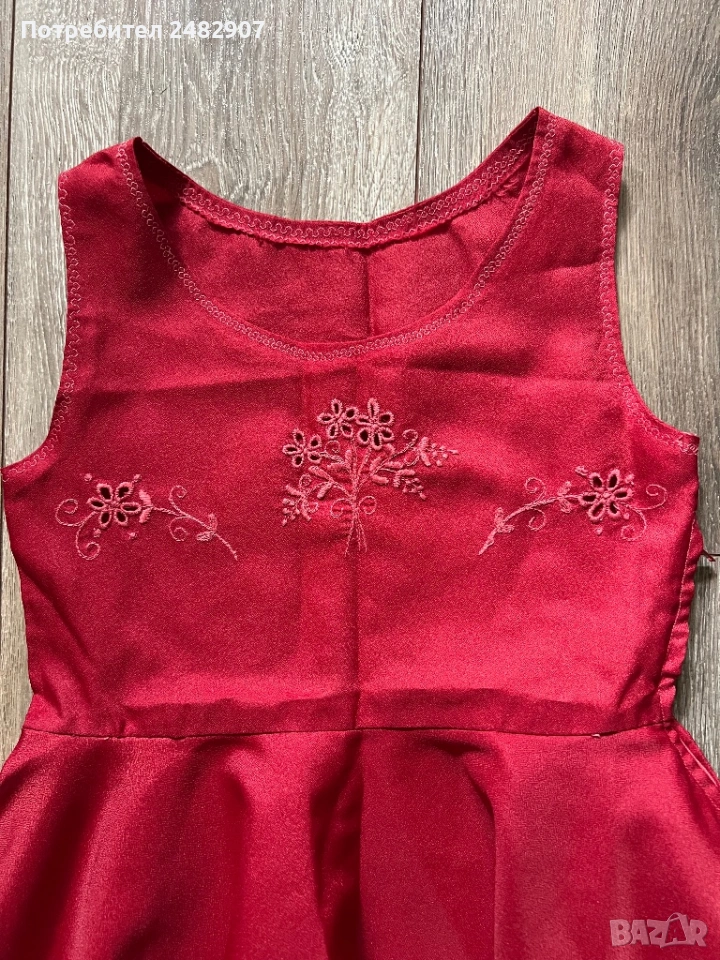 Червена детска рокля - ретро с бродерия за възраст 4-5 години. Ширина в раменете - 25 см, ширина под мишниците - 32 см, ширина в талията - 30 см, ширина в долната част - 83 см, дължина от рамото до долу - 57 см. Много запазена, почти не е използвана, със страничен цип вляво (13 см), подходяща за сценичен костюм.