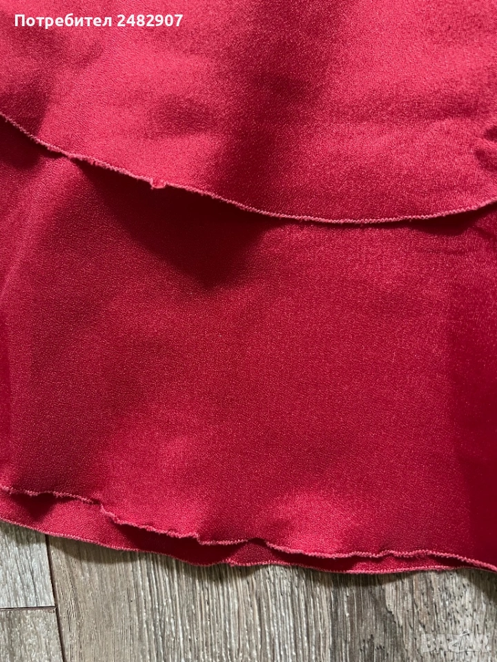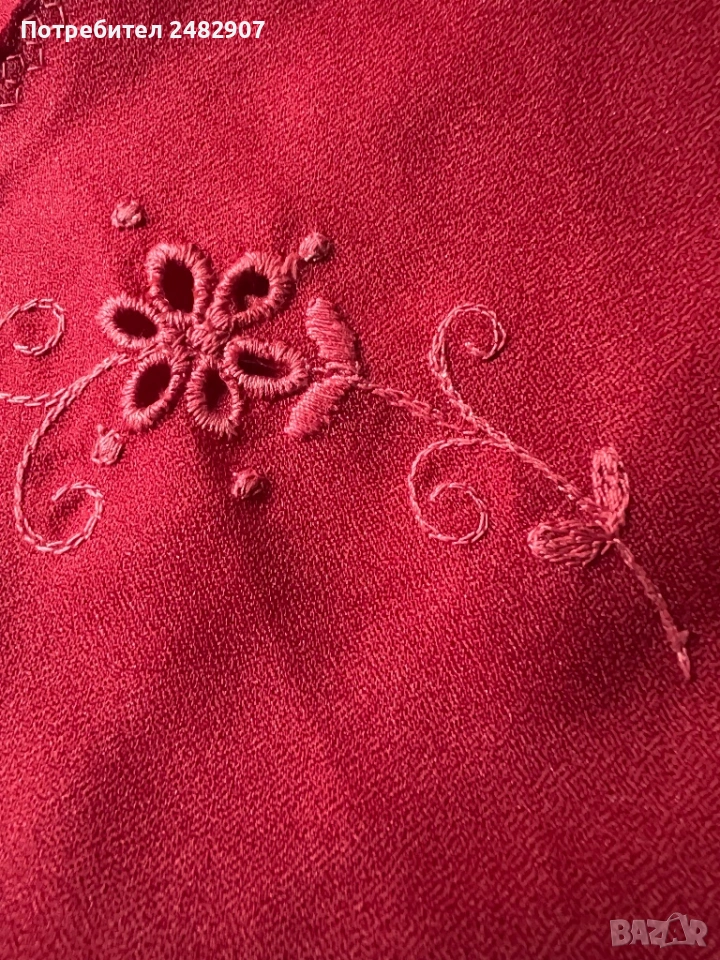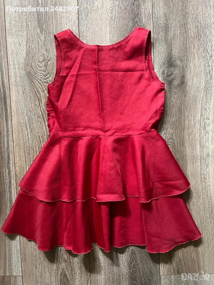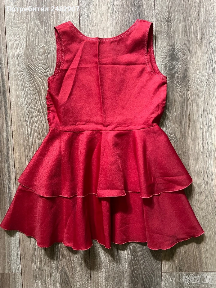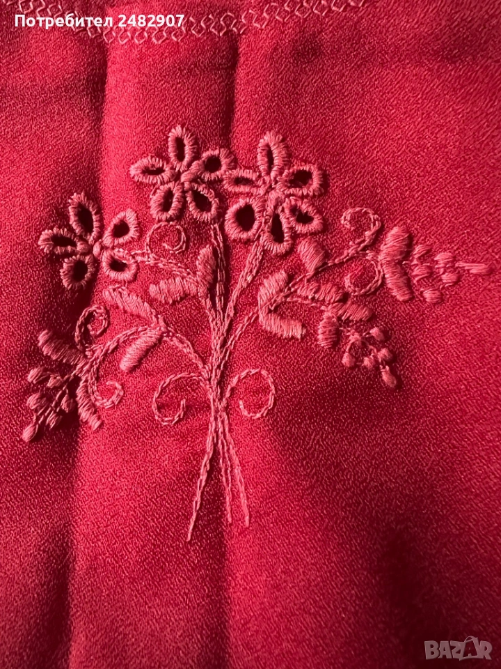 Червена детска рокля - ретро с бродерия за възраст 4-5 години. Ширина в раменете - 25 см, ширина под мишниците - 32 см, ширина в талията - 30 см, ширина в долната част - 83 см, дължина от рамото до долу - 57 см. Много запазена, почти не е използвана, със страничен цип вляво (13 см), подходяща за сценичен костюм.