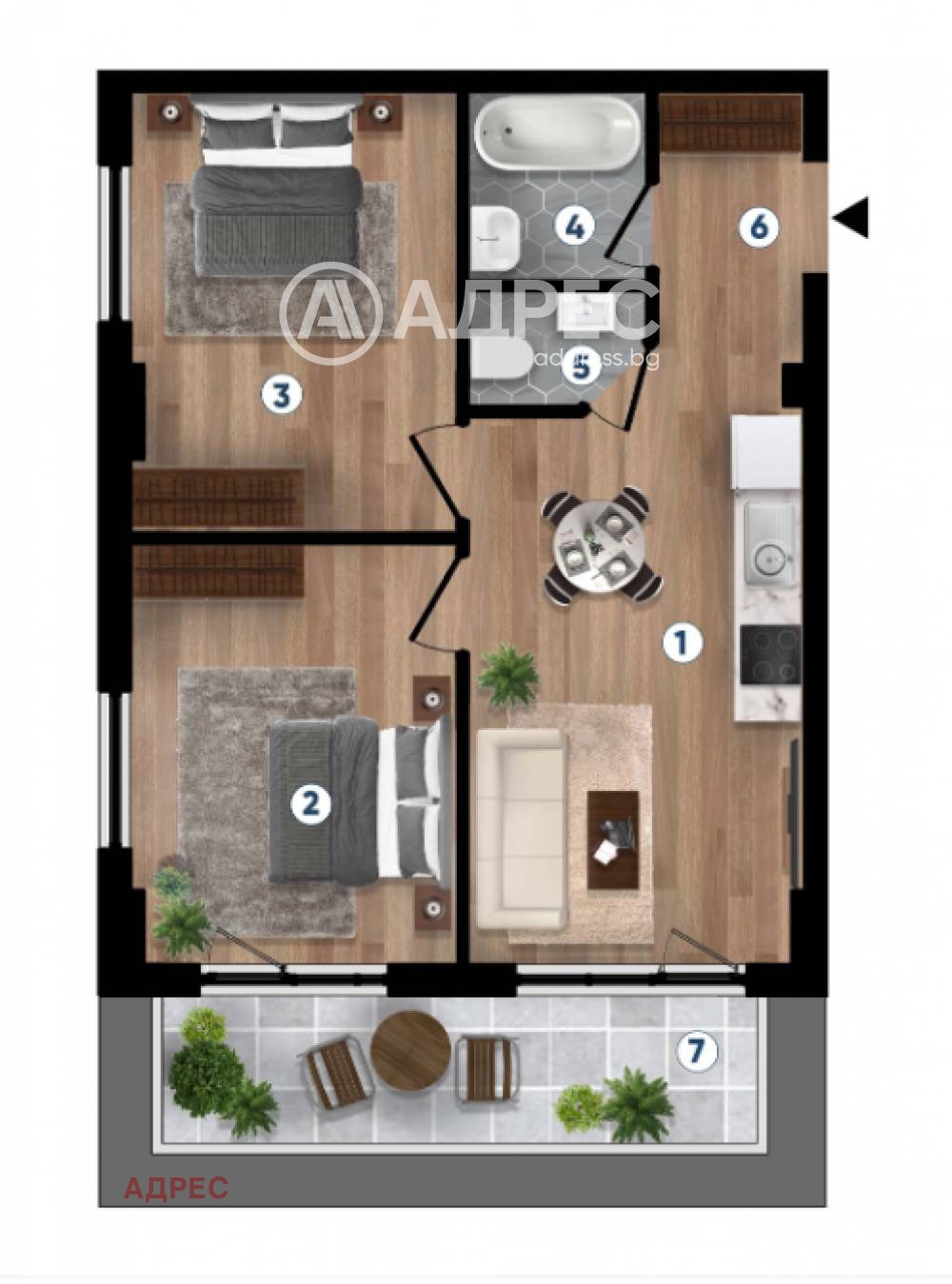 Предлагаме Ви тристаен апартамент на четвърти етаж, състоящ се от дневна с кухня и трапезария, 2 спални, баня с тоалетна, отделна тоалетна, коридор и огромна тераса- 126 м2 (бонус към апартамента). Имотът ще се издава по БДС с възможност завършене до ключ. Опция за обзавеждане по индивидуален интериорен проект.