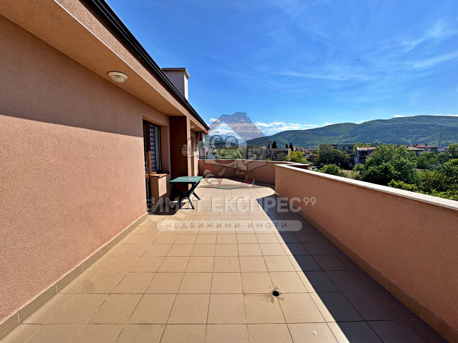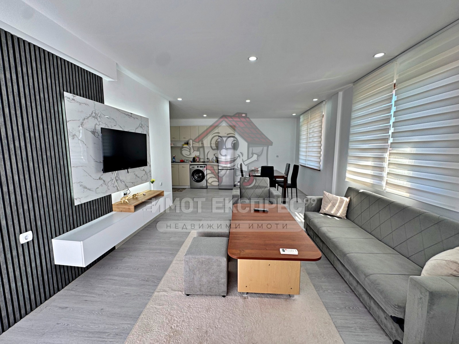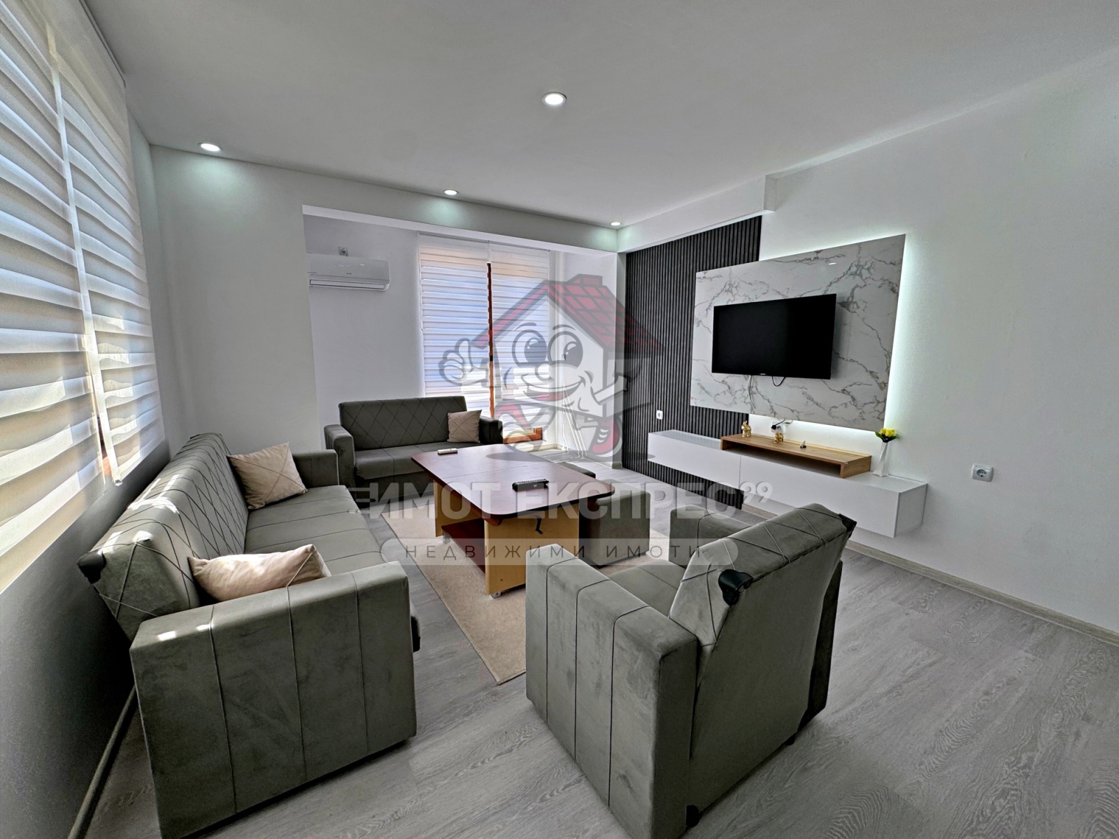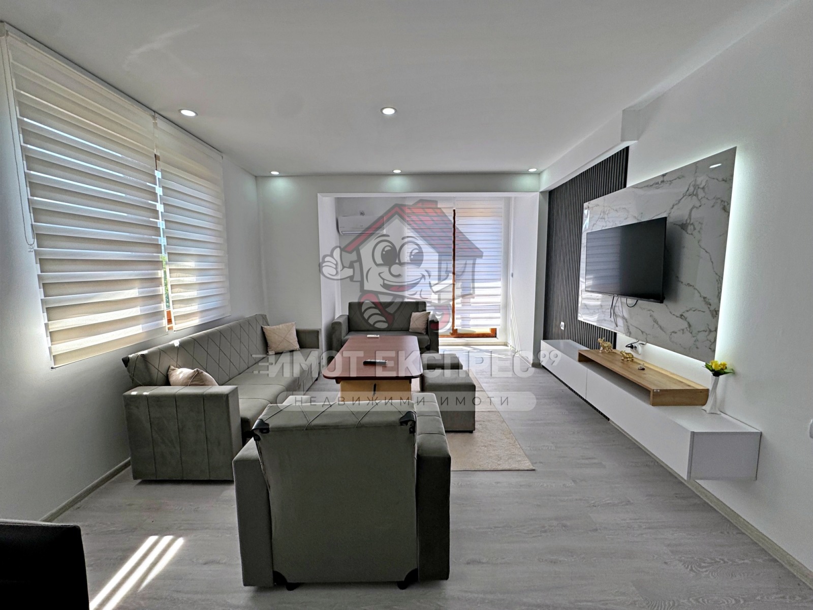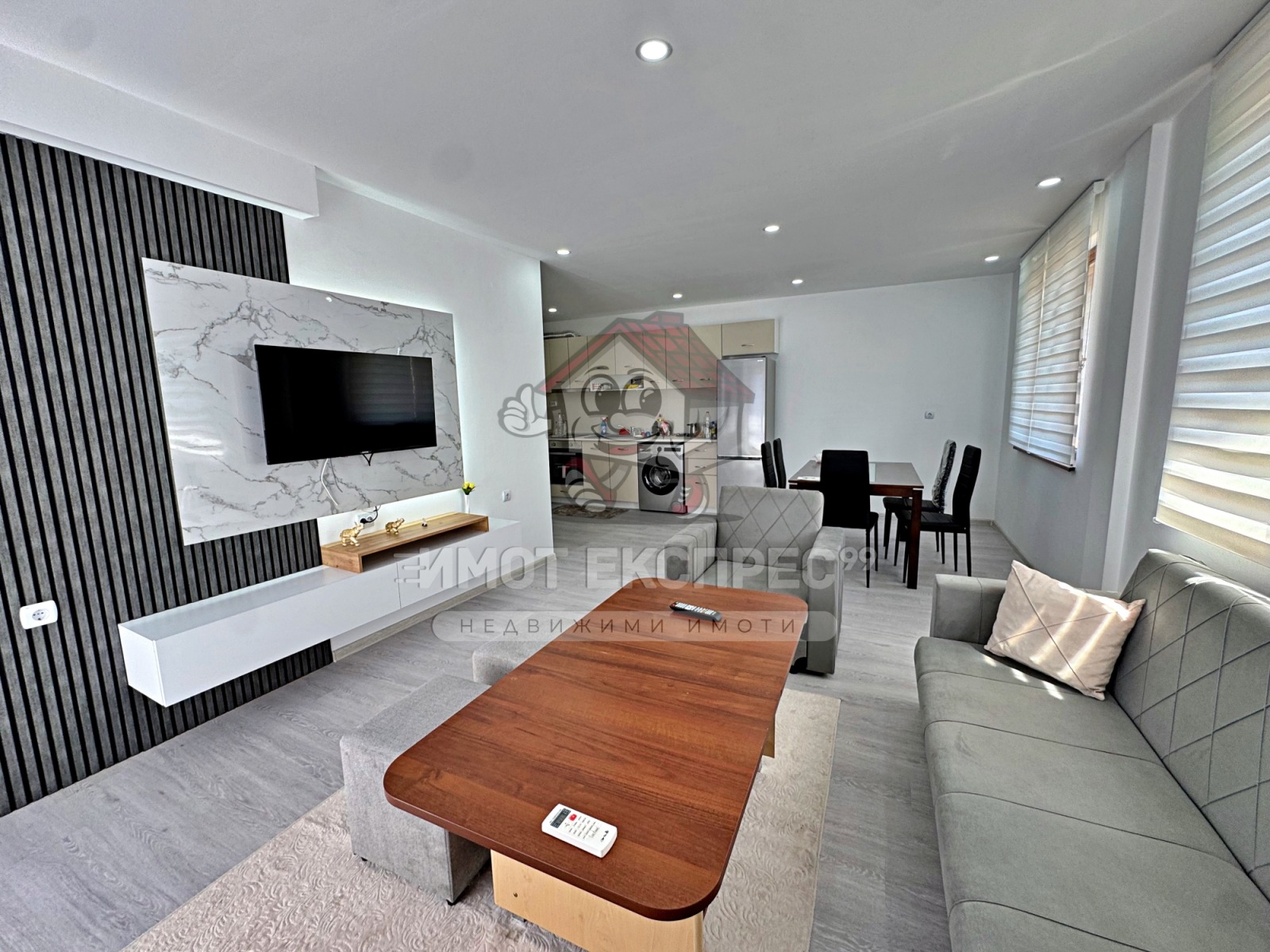 Тристаен обзаведен апартамент, ново строителство, с чиста площ 125кв.м, състоящ се от дневна с кухненски бокс, две спални, коридор, баня и тоалетна, голяма тераси, с панорамна гледка към града и планината. Апартаментът е с южно изложение. Към него има 12.041% ид.части от общите части на сградата. Продава се заедно с изба, с площ 4кв.м