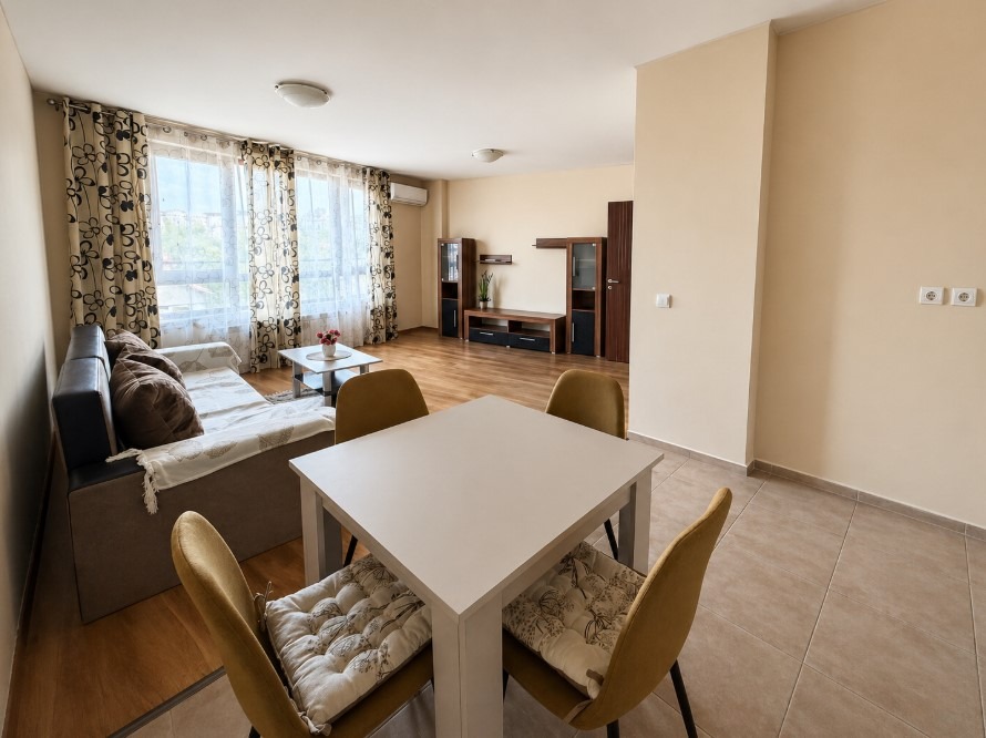 Имотът е обзаведен, с площ 80 кв.м, на 2-ри от 4 етажна сграда. Разпределението включва входно антре, хол с кухня и трапезария, спалня, баня с тоалетна и тераса.