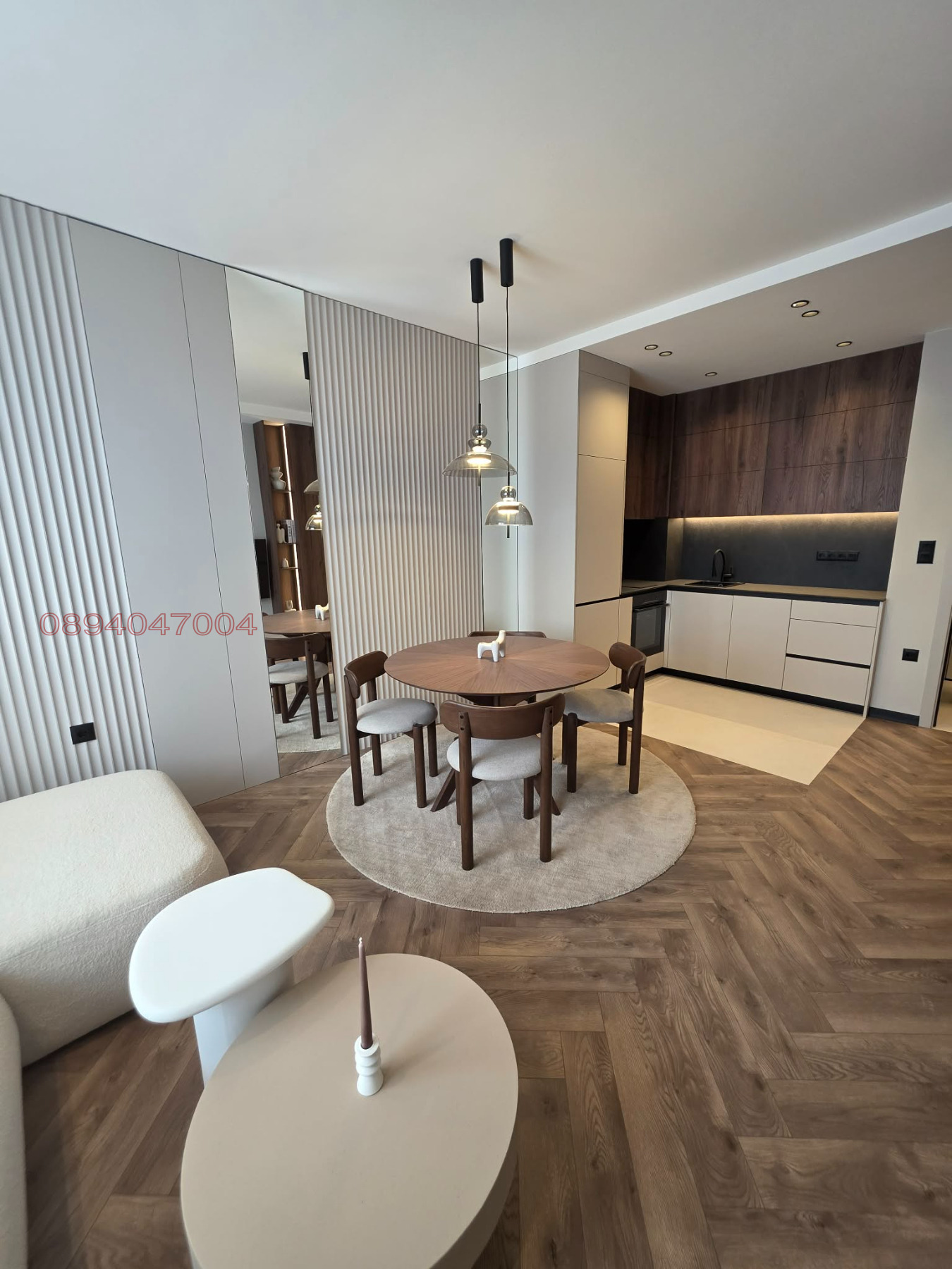 Дневен тракт и кухня: Просторната дневна е зонирана на кът за релакс с мека мебел (букле текстил), трапезария с кръгла маса от масивно дърво и напълно вградена кухня с висок клас уреди. Използвани са декоративни стенни панели и вградено LED осветление.