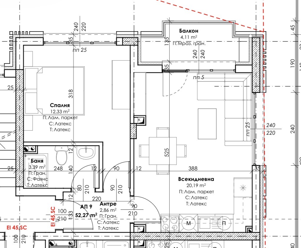 Разпределение: дневна с кухненски бокс, спалня, баня с тоалетна, антре и тераса .