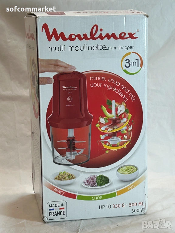 Moulinex Multi Moulinette AT714G32 е компактен 3-в-1 чопър, предназначен за кълцане, смесване и емулгиране на съставки. Уредът е подходящ за обработка на зеленчуци, билки, месо, ядки, както и за приготвяне на майонеза и леки сосове.