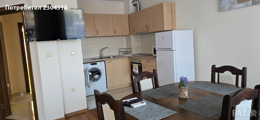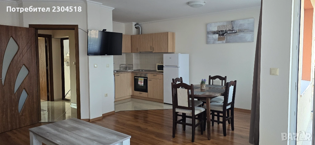 Разположен на втори жилищен етаж. Подходящ е за семейство с дeца (макс. 4 човека). На площ от 77 кв.м са разпределени: коридор, просторна всекидневна с кухненски бокс /хладилник, фурна и котлони, пералня, микровълнова, термокана, посуда и прибори, висока маса за хранене, телевизор, разтегателен диван и холна маса. /спалня, баня с тоалетна, две тераси. На разположение на гостите има дъска за гладене и ютия.