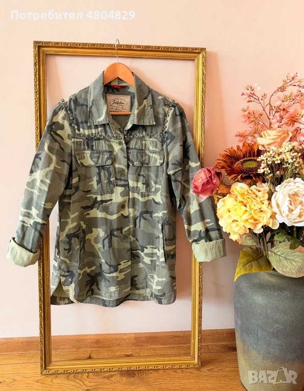 Изключително модерна и стилна дамска риза на ZARA в актуален милитари стил (камуфлажен десен). Ризата е истинско бижу благодарение на детайлната декорация от блестящи камъни в горната част около раменете и джобовете.