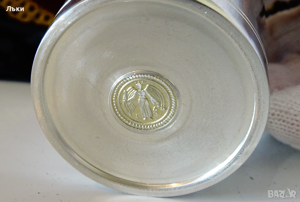 от 95% калай и 5% сребро,маркирана с релефен печат на производителя.Декорирана