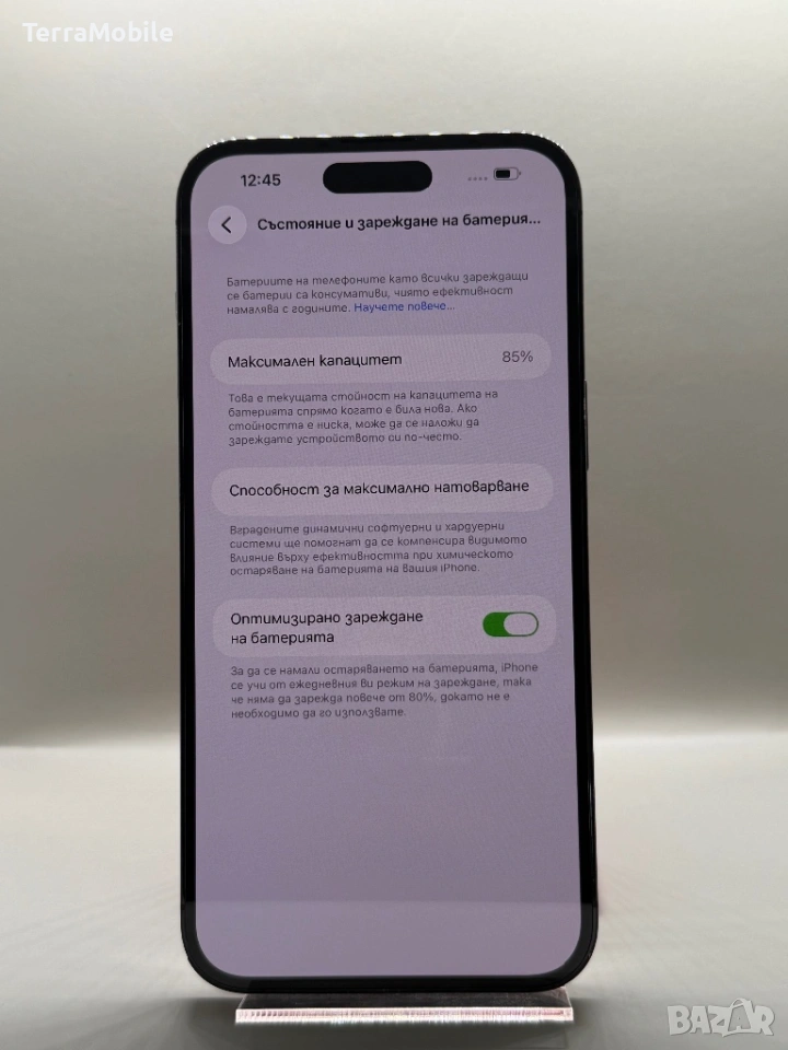 Батерия: 85% здраве (оригиналната, не е подменяна), което гарантира стабилна работа през целия ден.